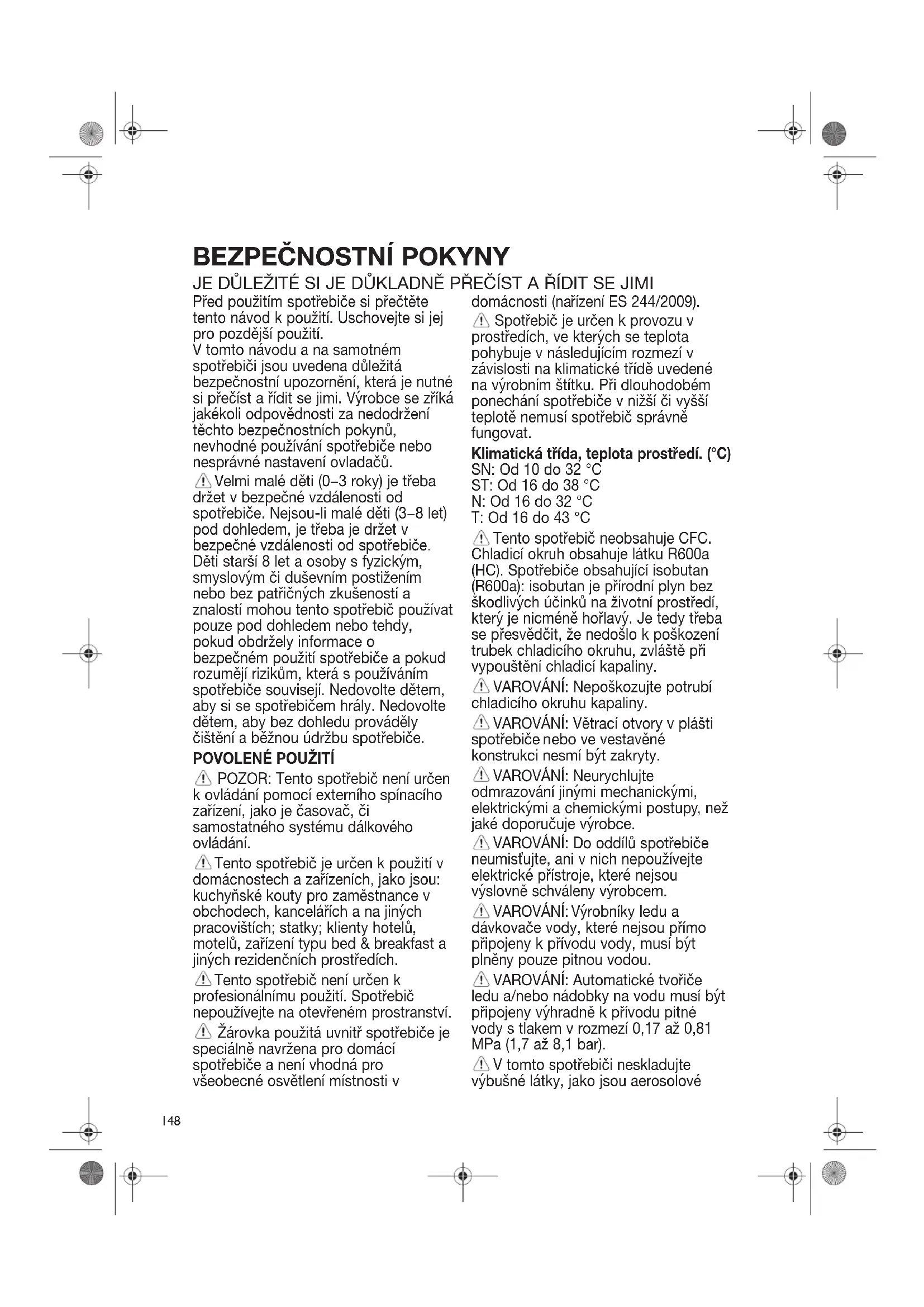 POZOR: Tento spotřebič není určen k ovládání pomocí externího spínacího zařízení, jako je časovač, či samostatného systému dálkového ovládání. Tento spotřebič je určen k použití v domácnostech a zařízeních, jako jsou: kuchyňské kouty pro zaměstnance v obchodech, kancelářích a na jinych pracovištích; statky; klienty hotelů, motelů, zařízení typu bed & breakfast a jinych rezidenčních prostředích. Tento spotřebič není určen k profesionálnímu použití. Spotřebič nepoužívejte na otevřeném prostranství. Žárovka použitá uvnitř spotřebiče je speciálně navržena pro domácí spotřebiče a není vhodná pro všeobecné osvětlení místnosti v domácnosti (na řízení ES 244/2009). Spotřebič je určen k provozu v prostředích, ve kterych se teplota pohybuje v následujícím rozmezí v závislosti na klimatické třídě uvedené na vyrobním štítku. Při dlouhodobém ponechání spotřebiče v nižší či vyšší teplotě nemusí spotřebič správně fungovat. Klimatická třída, teplota prostředí. (°C) SN: Od 10 do 32 °C ST: Od 16 do 38 °C N: Od 16 do 32 °C T: Od 16 do 43 °C Tento spotřebič neobsahuje CFC. Chladicí okruh obsahuje látku R600a (HC). Spotřebiče obsahující isobutan (R600a): isobutan je přírodní plyn bez škodlivych účinků na životní prostředí, ktery je nicméně hořlavy. Je tedy třeba se přesvědčit, že nedošlo k poškození trubek chladicího okruhu, zvláště při vypouštění chladicí kapaliny. VAROVÁNÍ: Nepoškozujte potrubí chladicího okruhu kapaliny. VAROVÁNÍ: Větrací otvory v plášti spotřebiče