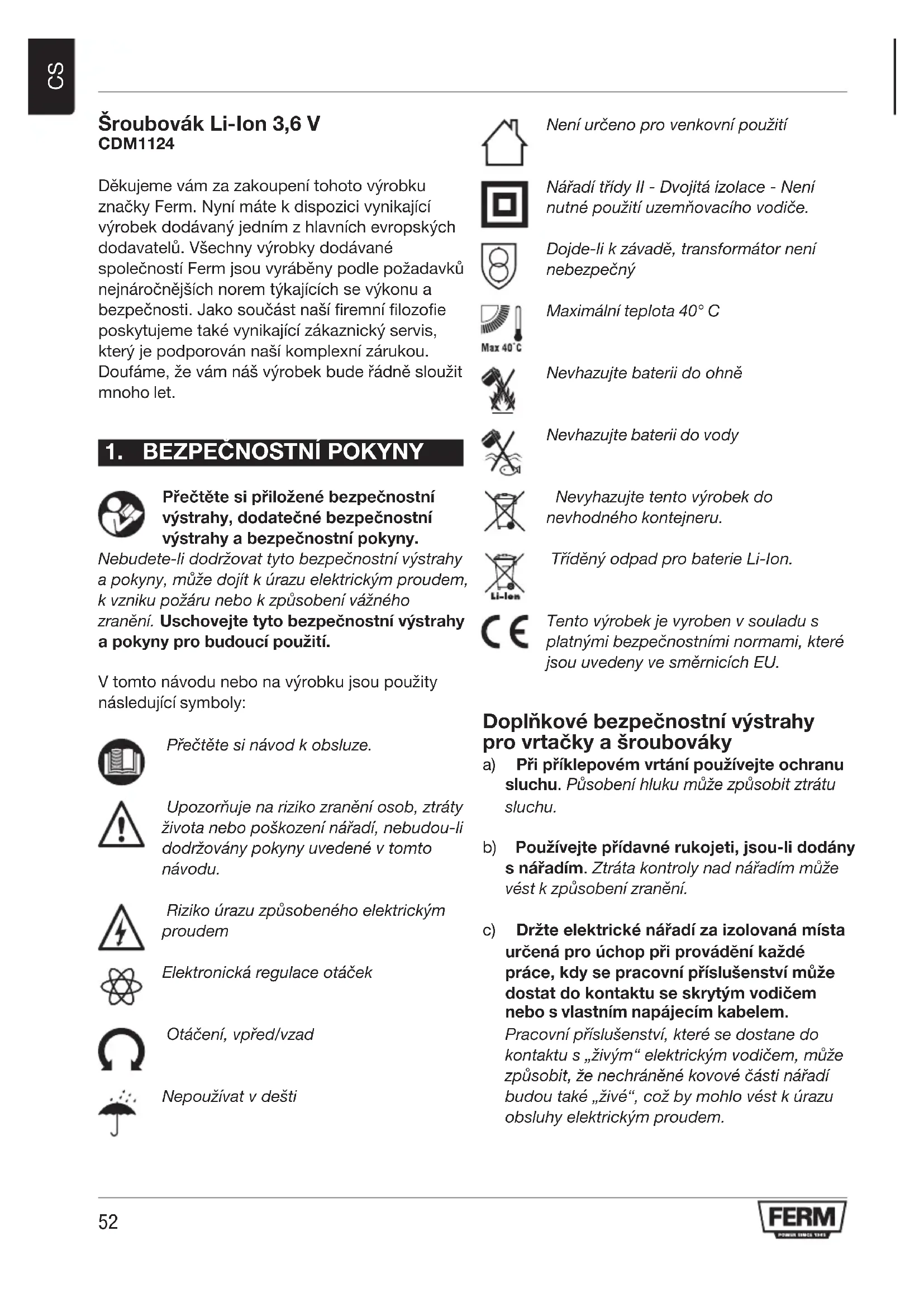 Šroubovák Li-Ion 3,6 V CDM1124 Děkujemevámzazakoupenítohotovýrobku značkyFerm.Nynímátekdispozicivynikající výrobekdodávanýjednímzhlavníchevropských dodavatelů.Všechnyvýrobkydodávané společnostíFermjsouvyráběnypodlepožadavků nejnáročnějšíchnoremtýkajícíchsevýkonua bezpečnosti.Jakosoučástnašífiremnífilozofie poskytujemetakévynikajícízákaznickýservis, kterýjepodporovánnašíkomplexnízárukou. Doufáme,ževámnášvýrobekbudeřádněsloužit mnoho let.