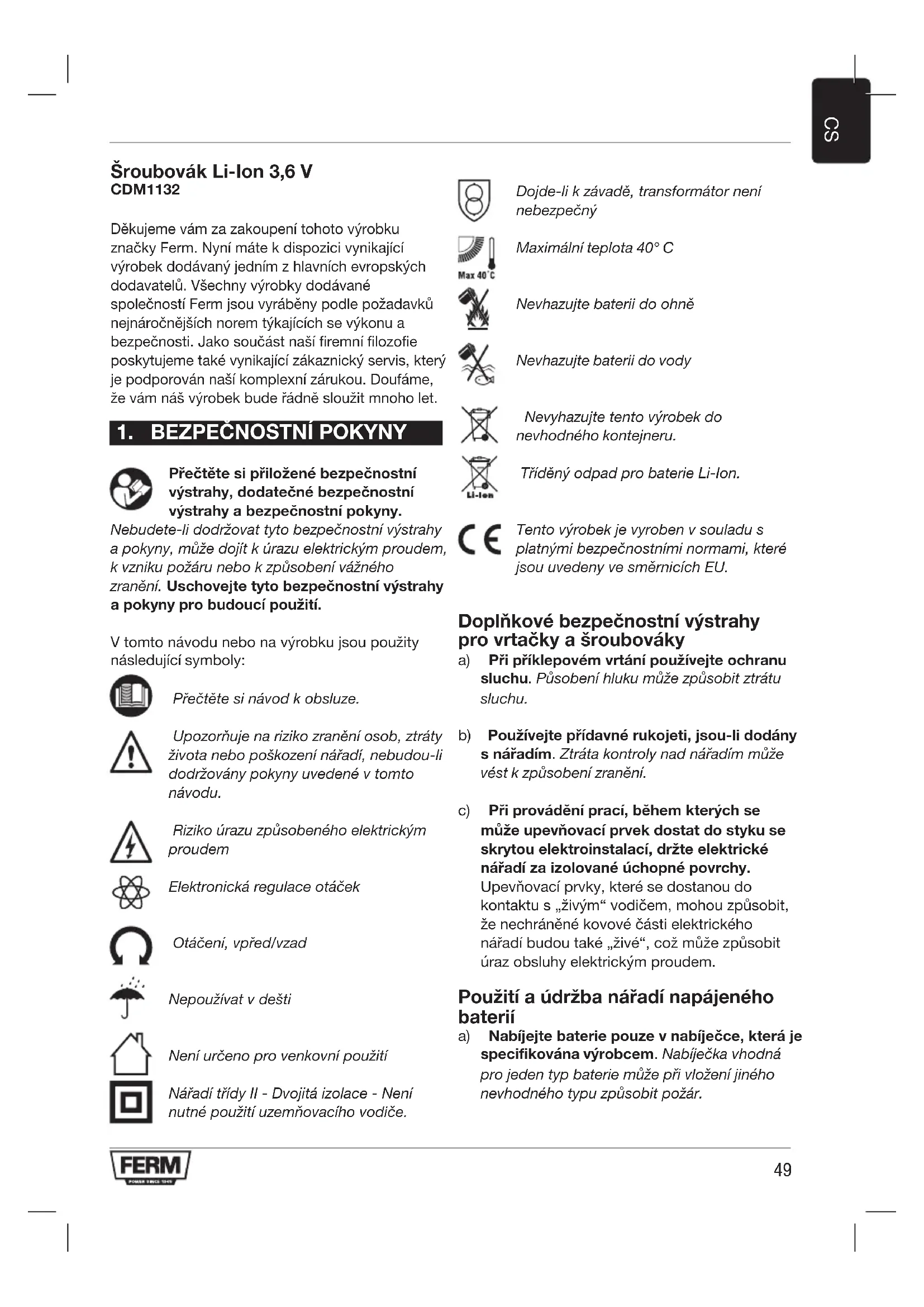 Šroubovák Li-Ion 3,6 V CDM1132 Děkujeme vám za zakoupení tohoto výrobku značky Ferm. Nyní máte k dispozici vynikající výrobek dodávaný jedním z hlavních evropských dodavatelů. Všechny výrobky dodávané společností Ferm jsou vyráběny podle požadavků nejnáročnějších norem týkajících se výkonu a bezpečnosti. Jako součást naší firemní filozofie poskytujeme také vynikající zákaznický servis, který je podporován naší komplexní zárukou. Doufáme, že vám náš výrobek bude řádně sloužit mnoho let.