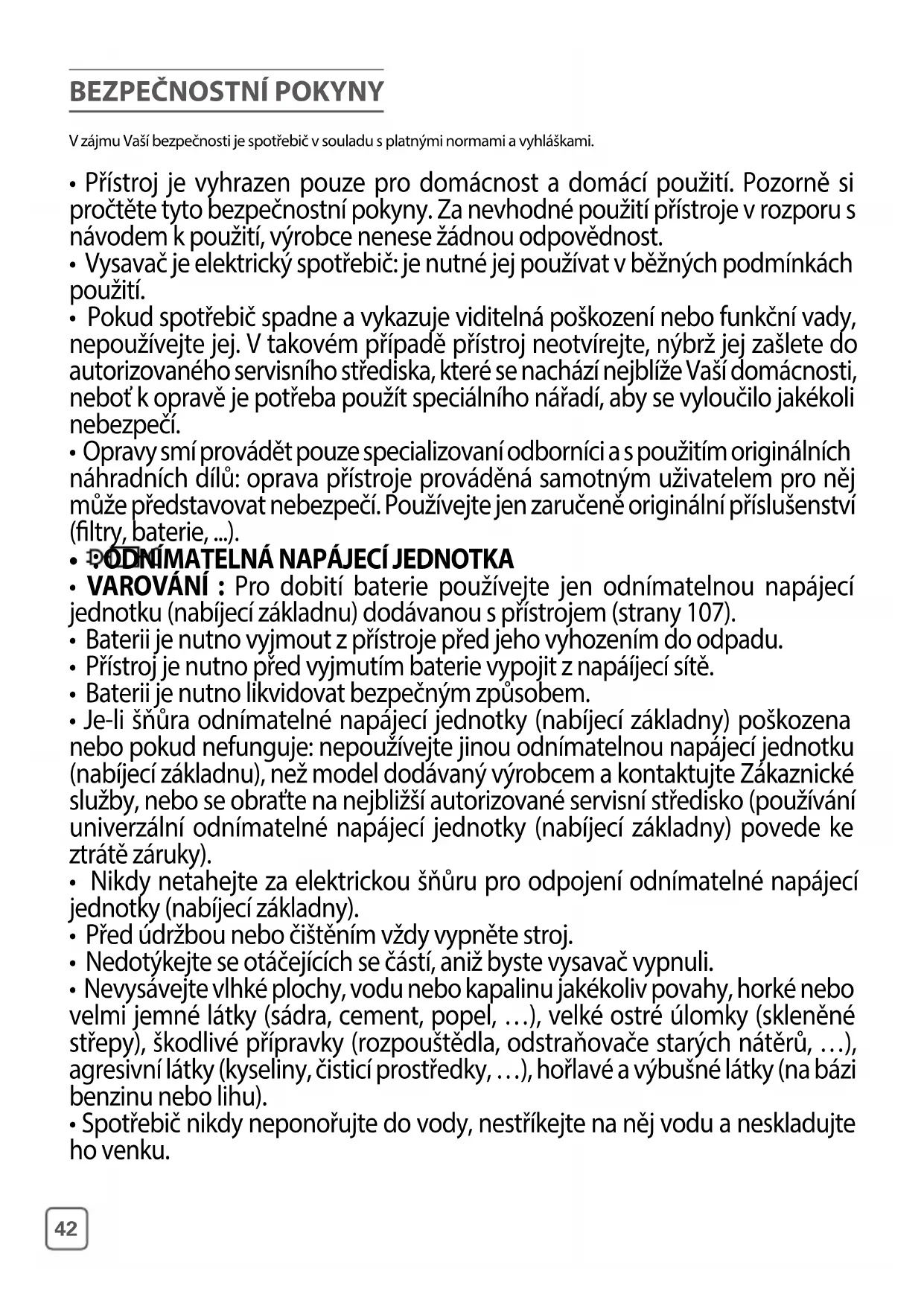 - Vysavač je elektrický spotřebič: je nutné jej používat v běžných podmínkách použití.