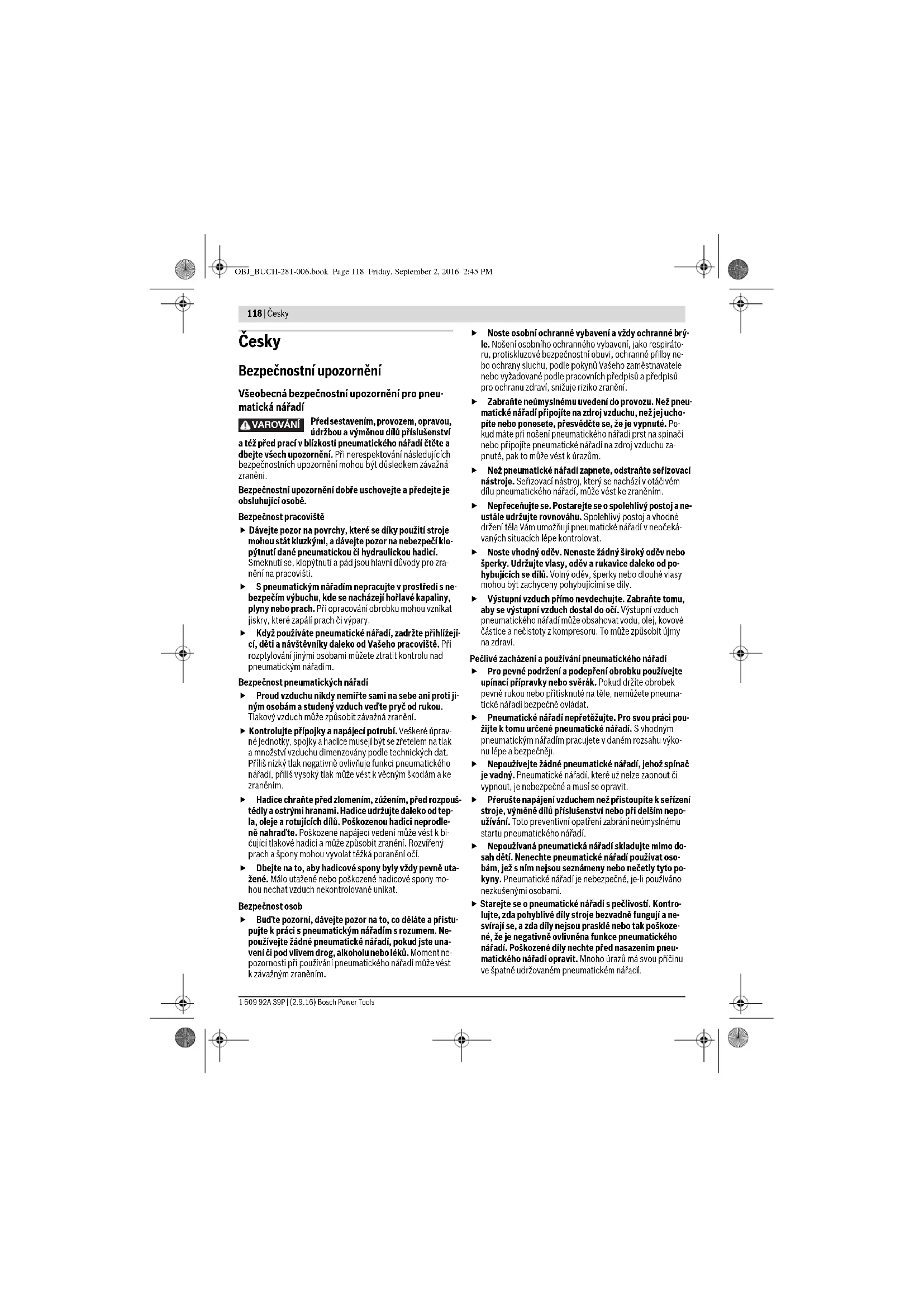 6,2 1,1 3,7 0,9 < 2,5 1,5 < 2,5 1,5 3,5 0,8 OBJ_BUCH-281-006.book Page 121 Friday, September 2, 2016 2:45 PM122 | Česky 1 609 92A 39P | (2.9.16) Bosch Power Tools Úroveň vibrací uvedená v těchto pokynech byla změřena po- mocí normované měřicí metody podle EN ISO 11148 a lze ji použít pro vzájemné porovnání pneumatického nářadí. Hodí se i pro předběžný odhad zatížení vibracemi. Uvedená úroveň vibrací reprezentuje hlavní použití pneuma- tického nářadí. Pokud se ovšem bude pneumatické nářadí po- užívat pro jiné práce, s odlišným příslušenstvím, s jinými ná- stroji nebo s nedostatečnou údržbou, může se úroveň vibrací lišit. To může zatíženi vibracemi po celou pracovní dobu zře- telně zvýšit. Pro přesný odhad zatížení vibracemi by měly být zohledněny i doby, kdy je pneumatické nářadí vypnuté nebo sice běží, ale fakticky se nepoužívá. To může zatíženi vibracemi po celou pracovní dobu zřetelně zredukovat. Stanovte dodatečná bezpečnostní opatření k ochraně obslu- hy před účinky vibrací, jako je např. údržba pneumatického nářadí a nástrojů, udržování teplých rukou, organizace pra- covních procesů. Prohlášení o shodě Prohlašujeme na výhradní zodpovědnost, že výrobek popsa- ný v části „Technické údaje“ splňuje všechna příslušná usta- novení směrnice 2006/42/ES včetně jejích změn a je v souladu s následujícími normami: EN ISO 11148-6. Technická dokumentace (2006/42/ES) u: Robert Bosch Power Tools GmbH, PT/ECS, 70538 Stuttgart, GERMANY Robert Bosch Power Tools GmbH 70538 Stuttgart, GERMANY Stuttgart, 01.01.2017 Montáž Přípravky pro bezpečné zacházení Pokud chcete pneumatické nářadí provozovat v závěs- ném nebo upínacím přípravku, dbejte na to, aby dříve než jej připojíte na zdroj tlakového vzduchu byl nejprve upnut do přípravku. Tím zabráníte neúmyslnému uvedení do provozu. Zavěšovací přípravek Pomocí závěsného oka 4 (0 607 450 593) nebo zavěšovací- ho třmenu 14 (0 607450 622) můžete pneumatické nářadí upevnit na zavěšovací přípravek. Pravidelně kontrolujte stav závěsného oka nebo zavě- šovacího třmenu a háků v zavěšovacím přípravku. Upevnění zavěšovacího třmenu (0 607 450 622) (viz obr. A) – Klíčem na vnitřní šestihran (6 mm) odšroubujte proti smě- ru hodinových ručiček horní přední šrouby 12 zkrytu pneumatického nářadí. –Odstraňte podložky 13 anasaďte je na šrouby 12. – Našroubujte zavěšovací třmen 14 pomocí šroubů a podložek po směru hodinových ručiček ke krytu pneuma- tického nářadí. Připojení na zdroj vzduchu Dbejte na to, aby tlak vzduchu nebyl nižší než 6,3 bar (91 psi), protože pneumatické nářadí je dimenzované na tento provozní tlak. Pro maximální výkon musejí být zachovány hodnoty světlosti hadice a též připojovací závity, jak je uvedeno v tabulce „Tech- nická data“. Pro zachování plného výkonu používejte pouze hadice do délky maximálně 4 m. Přiváděný tlakový vzduch musí být bez cizích těles a vlhkosti, aby bylo pneumatické nářadí chráněno před poškozením, znečištěním a tvorbou rzi. Upozornění: Je nutné použití úpravné jednotky tlakového vzduchu. Ta zaručuje bezvadnou funkci pneumatického nářa- dí. Dbejte návodu k obsluze úpravné jednotky. Veškeré armatury, spojovací vedení a hadice musejí být di- menzovány podle tlaku a potřebného množství vzduchu. Zabraňte zúžení přívodních vedení, např. smáčknutím, zlo- mením nebo cloumáním! Ve sporných případech zkontrolujte tlak na vstupu vzduchu pomocí manometru při zapnutém pneumatickém nářadí. Připojení zdroje vzduchu na pneumatické nářadí Upozornění: Hadici přívodního vzduchu upevněte vždy nej- prve na pneumatické nářadí, potom na úpravnou jednotku. 0 607 450 593 (viz obr. B) –Odstraňte uzavírací kryt 10 z připojovacího závitu u přívodu vzduchu 7. – Našroubujte hadicovou vsuvku 15 do připojovacího závitu u přívodu vzduchu 7. Abyste zabránili poškození vnitřních částí ventilu pneuma- tického nářadí, měli byste při zašroubovávání a vyšroubovávání hadicové vsuvky 15 přidržovat přečníva- jící připojovací závit u přívodu vzduchu 7 stranovým klíčem (otvor klíče 26 mm). – Uvolněte hadicové spony 16 hadice přívodního vzduchu 17 a hadici přívodního vzduchu upevněte na hadicovou vsuvku 15 tím, že hadicovou sponu pevně utáhnete. 0 607 450 622/... 626/... 627/... 628 (viz obr. C) –Odstraňte uzavírací kryt 10 z připojovacího závitu u přívodu vzduchu 7. – Našroubujte nátrubek 18 do připojovacího závitu u přívodu vzduchu 7. Abyste zabránili poškození částí ventilu pneumatického nářadí, které se nacházejí uvnitř, měli byste při zašroubo- vávání a vyšroubovávání nátrubku 18 přidržovat přečníva- jící připojovací závit přívodu vzduchu 7 stranovým klíčem (otvor klíče 22 mm). –Nasaďte hadici přívodního vzduchu 17 s odpovídající spoj- kou 19 na nátrubek 18. Henk Becker Executive Vice President Engineering Helmut Heinzelmann Head of Product Certification PT/ECS OBJ_BUCH-281-006.book Page 122 Friday, September 2, 2016 2:45 PMČesky | 123 Bosch Power Tools 1 609 92A 39P | (2.9.16) Výměna nástroje Přerušte zásobování vzduchem dříve, než přistoupíte k seřízení stroje, výměně dílů příslušenství nebo pneu- matické nářadí odložíte. Toto preventivní opatření zabrá- ní neúmyslnému startu pneumatického nářadí. Dbejte při nasazování nástroje na to, aby nástroj pevně seděl na nástrojovém držáku. Pokud není nástroj pevně spojený s nástrojovým držákem, pak se může opět uvolnit a již jej nelze kontrolovat. Nasazení nástroje – Nasazovací nástroj 1 nasuňte na čtyř