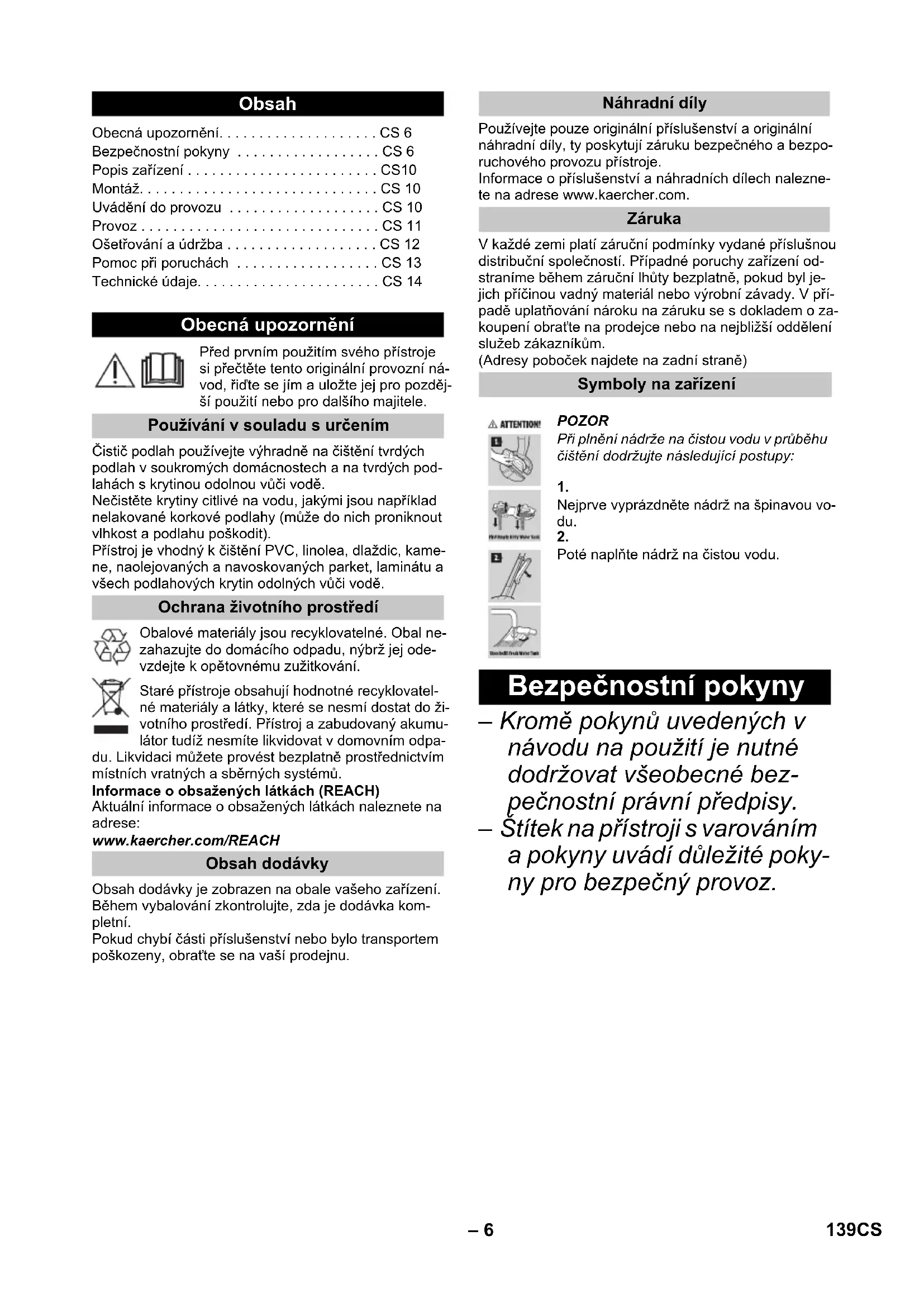 Poté naplňte nádrž na čistou vodu. Bezpečnostní pokyny 139CS– 7 NEBEZPEČÍ Upozornění na bezprostředně hrozící nebezpečí, které vede k těžkým fyzickým zraněním nebo k usmrcení. 몇 VAROVÁNÍ Upozornění na potencionálně nebezpečnou situaci, která by mohla vést k těžkým fyzickým zraněním nebo usmrcení. 몇 UPOZORNĚNÍ Upozornění na případnou ne- bezpečnou situaci, která může vést k lehkým fyzickým zraně- ním. POZOR Upozornění na potenciálně ne- bezpečnou situaci, která může mít za následek poškození ma- jetku. NEBEZPEČÍ Neponořujte přístroj do vody! Před použitím zařízení zkont- rolujte zařízení a příslušen- ství, zda jsou v pořádku. Po- kud jejich stav není bez zá- vad, nesmí se zařízení použí- vat. Nabíječku s nabíjecím kabe- lem při viditelném poškození neprodleně vym ěňte za origi- nální náhradní díl. Než začnete provádět jakou- koliv péči nebo údržbu, zaří- zení vypněte a vytáhněte zá- strčku ze sítě. Veškeré opravářské práce na přístroji smí provádět pouze autorizovaná servisní služba firmy Kärcher. Přístroj obsahuje elektrické konstrukční prvky, které se nesmějí čistit pod tekoucí vo- dou. Do nabíjecí zdířky nezasunuj- te vodivé předměty (např. šroubovák nebo podobné). Nedotýkejte se kontaktů ani vedení. Údaje o napětí uvedené na typovém štítku musejí sou- hlasit s napájecím napětím. Síťový kabel netahejte přes ostré hrany a zamezte jeho skřípnutí. 몇 VAROVÁNÍ Přístroj smí být zapojen jen k takové el. přípojce, která byla zabudována odborným elek- trikářem v souladu s normou IEC 60364. Přístroj zapojujte pouze k pří- pojkám se st řídavým prou- dem. Napětí musí být shodné s údaji o napětí na typovém štítku přístroje. Z bezpečnostních důvodů zá- sadně doporučujeme provo- zovat zařízení přes ochranný spínač proti zbytkovému proudu (maximálně 30 mA). NEBEZPEČÍ Nebezpečí úrazu elektrickým proudem. Nikdy se nedotýkejte síťové zástrčky ani zásuvky vlhkýma rukama. Stupně nebezpečí Elektrické komponenty Nabíječka 140 CS– 8 Nabíječku nepoužívejte zne- čištěnou ani mokrou. Nabíječku nepoužívejte v prostředí s nebezpečím vý- buchu. Nabíječku nenoste ze síťový kabel. Nabíječku používejte a uklá- dejte jen v suchých prosto- rách. Síťový kabel chraňte před horkem, ostrými hranami, olejem a pohyblivými sou- částmi. Nepoužívejte prodlužovací kabely s více zásuvkami a více připojenými přístroji zá- roveň. Síťovou zástrčku neodpojuje ze zásuvky taháním za síťový kabel. Nabíječku nezakrývejte a vět- rací štěrbiny nechávejte vol- né. Nabíječku neotvírejte. Opra- vy nechte provádět odborní- kům. Nabíječku používejte pouze k nabíjení schválených akumu- látorů. Nabíječku s nabíjecím kabe- lem při viditelném poškození neprodleně vyměňte za origi- nální náhradní díl.