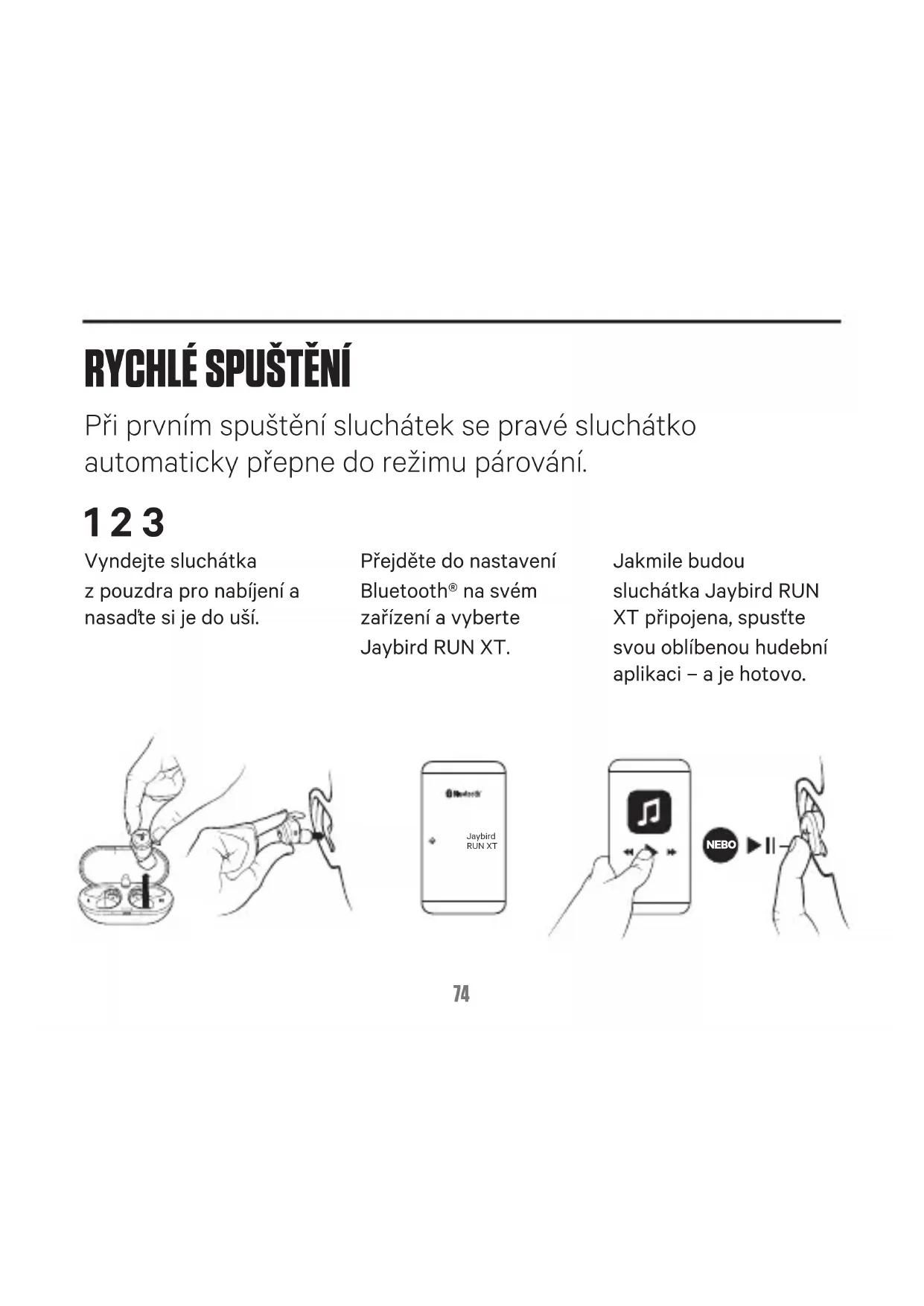 Vyndejte sluchátka zpouzdra pro nabíjení a nasaďte si je do uší. Přejděte do nastavení Bluetooth® na svém zařízení a vyberte Jaybird RUN XT. Jakmile budou sluchátka Jaybird RUN XT připojena, spusťte svou oblíbenou hudební aplikaci – a je hotovo. Při prvním spuštění sluchátek se pravé sluchátko automaticky přepne do režimu párování.