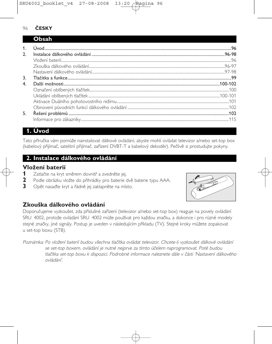 Úvod96 Instalace dálkového ovládání 96-98 Vložení baterií96 Zkouška dálkového ovládání96-97 Nastavení dálkového ovládání97-98 Tlačítka a funkce99 Další možnosti100-102 Označení oblíbených tlačítek100 Ukládání oblíbených tlačítek 100-101 Aktivace Duálního pohotovostního režimu101 Obnovení původních funkcí dálkového ovládání 102 Řešení problémů 102 Informace pro zákazníky115