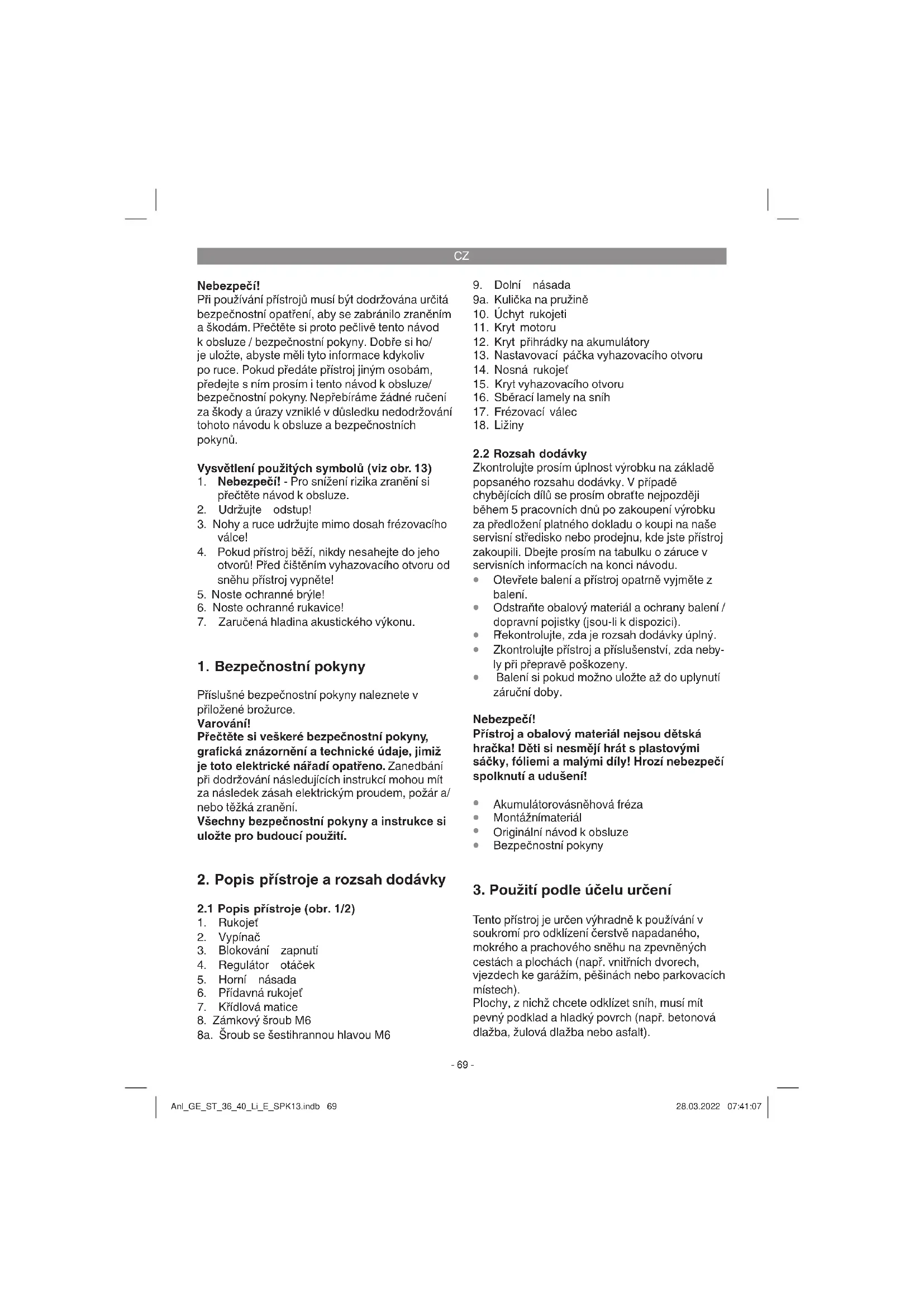 Tento přístroj je určen výhradně k používání v soukromí pro odklízení čerstvě napadaného, mokrého a prachového sněhu na zpevněných cestách a plochách (např. vnitřních dvorech, vjezdech ke garážím, pěšinách nebo parkovacích místech). Plochy, z nichž chcete odklízet sníh, musí mít pevný podklad a hladký povrch (např. betonová dlažba, žulová dlažba nebo asfalt). Anl_GE_ST_36_40_Li_E_SPK13.indb 69Anl_GE_ST_36_40_Li_E_SPK13.indb 69 28.03.2022 07:41:0728.03.2022 07:41:07CZ