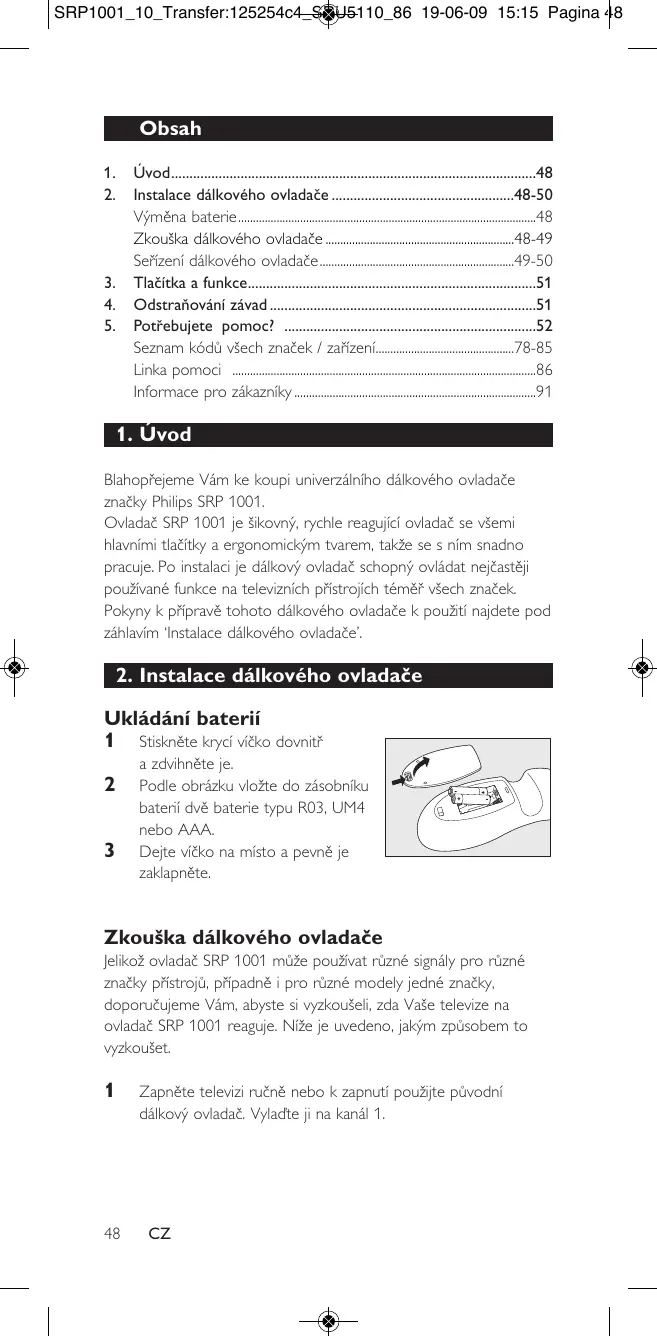 Úvod48 Instalace dálkového ovladače 48-50 Výměna baterie48 Zkouška dálkového ovladače 48-49 Seřízení dálkového ovladače49-50 Tlačítka a funkce51 Odstraňování závad 51 Potřebujete pomoc? 52 Seznam kódů všech značek / zařízení78-85 Linka pomoci 86 Informace pro zákazníky 91