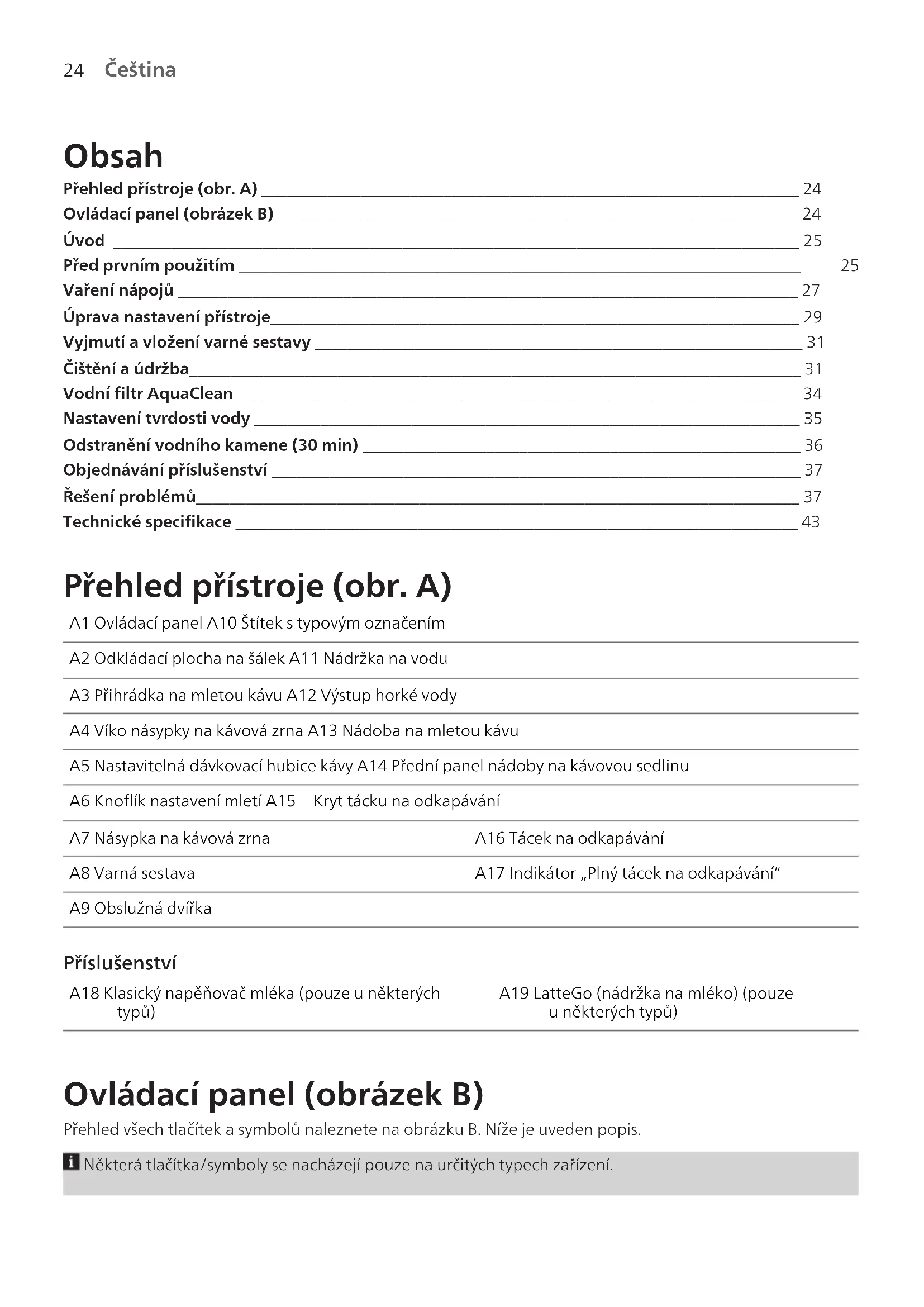 Čeština Čeština Obsah Přehled přístroje (obr.A) _________________________________________________________________ 24Ovládací panel (obrázekB) _______________________________________________________________ 24Úvod ___________________________________________________________________________________ 25 Před prvním použitím ____________________________________________________________________ 25 Vaření nápojů ___________________________________________________________________________ 27Úprava nastavení přístroje________________________________________________________________ 29Vyjmutí avložení varné sestavy ___________________________________________________________ 31Čištění aúdržba__________________________________________________________________________ 31Vodní filtr AquaClean ____________________________________________________________________ 34Nastavení tvrdosti vody __________________________________________________________________ 35Odstranění vodního kamene (30min) _____________________________________________________ 36Objednávání příslušenství ________________________________________________________________ 37Řešení problémů_________________________________________________________________________ 37Technické specifikace ____________________________________________________________________ 43 Přehled přístroje (obr.A) A1 Ovládací panel A10 Štítek stypovým označenímA2 Odkládací plocha na šálek A11 Nádržka na voduA3 Přihrádka na mletou kávu A12 Výstup horké vodyA4 Víko násypky na kávová zrna A13 Nádoba na mletou kávuA5 Nastavitelná dávkovací hubice kávy A14 Přední panel nádoby na kávovou sedlinuA6 Knoflík nastavení mletí A15 Kryt tácku na odkapáváníA7 Násypka na kávová zrna A16 Tácek na odkapáváníA8 Varná sestava A17 Indikátor „Plný tácek na odkapávání“A9 Obslužná dvířka Příslušenství A18 Klasický napěňovač mléka (pouze uněkterýchtypů)A19 LatteGo (nádržka na mléko) (pouzeuněkterých typů) Ovládací panel (obrázekB) Přehled všech tlačítek asymbolů naleznete na obrázkuB. Níže je uveden popis. Některá tlačítka/symboly se nacházejí pouze na určitých typech zařízení.25 Čeština Čeština B1 Vypínač B7 Varovné symboly B2 Symboly nápojů* B8 Kontrolka spuštění B3 Symbol intenzity aromatu / mleté kávy B9 Tlačítko spuštění/zastavení B4 Symbol množství nápoje B10 Symbol funkce Calc/Clean B5 Symbol množství mléka (pouze uněkterých typů) B11 Symbol AquaClean B6 Symbol teploty kávy (pouze uněkterých typů)