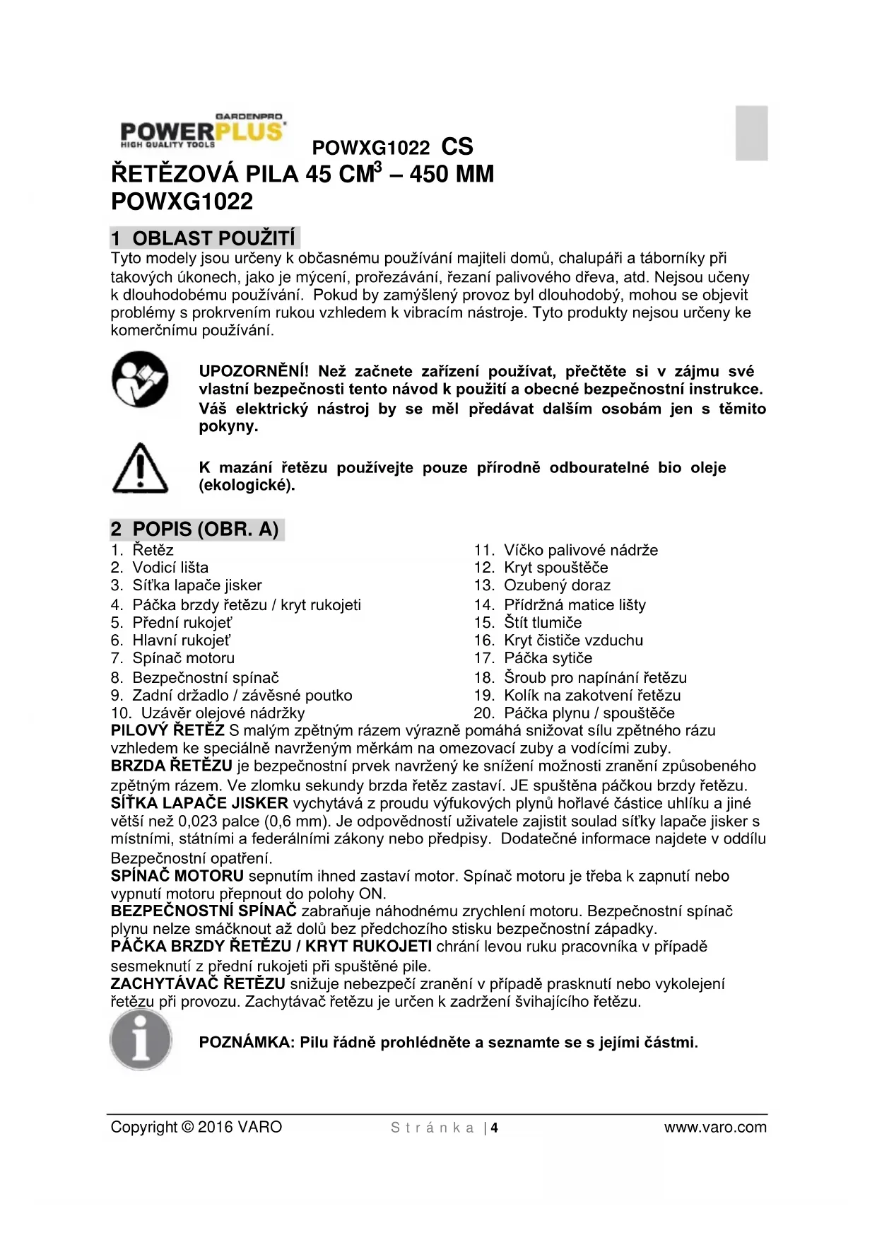 Tyto modely jsou určeny k občasnému používání majiteli domů, chalupáři a táborníky při takových úkonech, jako je mýcení, prořezávání, řezaní palivového dřeva, atd. Nejsou učeny k dlouhodobému používání. Pokud by zamýšlený provoz byl dlouhodobý, mohou se objevit problémy s prokrvením rukou vzhledem k vibracím nástroje. Tyto produkty nejsou určeny ke komerčnímu používání. UPOZORNĚNÍ! Než začnete zařízení používat, přečtěte si v zájmu své vlastní bezpečnosti tento návod k použití a obecné bezpečnostní instrukce. Váš elektrický nástroj by se měl předávat dalším osobám jen s těmito pokyny. K mazání řetězu používejte pouze přírodně odbouratelné bio oleje (ekologické). 2 POPIS (OBR. A)
