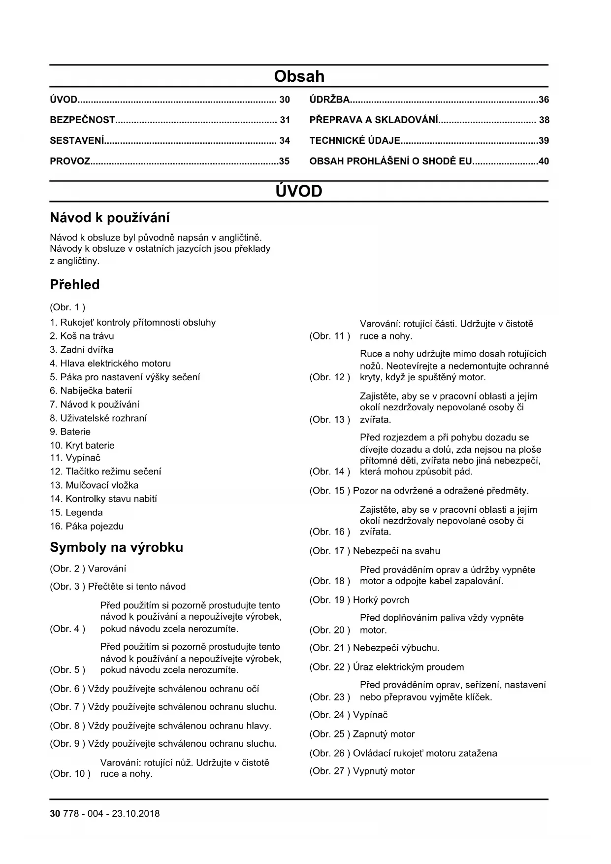 Symboly na výrobku (Obr. 2 ) Varování (Obr. 3 ) Přečtěte si tento návod (Obr. 4 ) Před použitím si pozorně prostudujte tento návod k používání a nepoužívejte výrobek, pokud návodu zcela nerozumíte. (Obr. 5 ) Před použitím si pozorně prostudujte tento návod k používání a nepoužívejte výrobek, pokud návodu zcela nerozumíte. (Obr. 6 ) Vždy používejte schválenou ochranu očí (Obr. 7 ) Vždy používejte schválenou ochranu sluchu. (Obr. 8 ) Vždy používejte schválenou ochranu hlavy. (Obr. 9 ) Vždy používejte schválenou ochranu sluchu. (Obr. 10 ) Varování: rotující nůž. Udržujte v čistotě ruce a nohy. (Obr. 11 ) Varování: rotující části. Udržujte v čistotě ruce a nohy. (Obr. 12 ) Ruce a nohy udržujte mimo dosah rotujících nožů. Neotevírejte a nedemontujte ochranné kryty, když je spuštěný motor. (Obr. 13 ) Zajistěte, aby se v pracovní oblasti a jejím okolí nezdržovaly nepovolané osoby či zvířata. (Obr. 14 ) Před rozjezdem a při pohybu dozadu se dívejte dozadu a dolů, zda nejsou na ploše přítomné děti, zvířata nebo jiná nebezpečí, která mohou způsobit pád. (Obr. 15 ) Pozor na odvržené a odražené předměty. (Obr. 16 ) Zajistěte, aby se v pracovní oblasti a jejím okolí nezdržovaly nepovolané osoby či zvířata. (Obr. 17 ) Nebezpečí na svahu (Obr. 18 ) Před prováděním oprav a údržby vypněte motor a odpojte kabel zapalování. (Obr. 19 ) Horký povrch (Obr. 20 ) Před doplňováním paliva vždy vypněte motor. (Obr. 21 ) Nebezpečí výbuchu. (Obr. 22 ) Úraz elektrickým proudem (Obr. 23 ) Před prováděním oprav, seřízení, nastavení nebo přepravou vyjměte klíček. (Obr. 24 ) Vypínač (Obr. 25 ) Zapnutý motor (Obr. 26 ) Ovládací rukojeť motoru zatažena (Obr. 27 ) Vypnutý motor 30 778 - 004 - 23.10.2018(Obr. 28 ) Ovládací rukojeť motoru odpojena (Obr. 29 ) Výfukové plyny obsahují oxid uhelnatý, jedovatý a velmi nebezpečný plyn bez zápachu. Nenechávejte výrobek spuštěný ve vnitřních nebo uzavřených prostorech. (Obr. 30 ) Výfukové plyny obsahují oxid uhelnatý, jedovatý a velmi nebezpečný plyn bez zápachu. Nenechávejte výrobek spuštěný ve vnitřních nebo uzavřených prostorech. (Obr. 31 ) Výrobek ani obal nelze likvidovat jako domácí odpad. Výrobek a obal musí být odevzdány do příslušné recyklační stanice pro recyklaci elektrických a elektronických zařízení. (Obr. 32 ) Neponechávejte, neskladujte ani nepoužívejte výrobek v dešti nebo ve vlhkém prostředí. (Obr. 33 ) Recyklace (Obr. 34 ) Hladina akustického výkonu (Obr. 35 ) Výrobek odpovídá příslušným směrnicím ES (Obr. 36 ) Tento výrobek odpovídá příslušným směrnicím EAC. (Obr. 37 ) Tento výrobek odpovídá příslušným směrnicím platným na Ukrajině. Odpovědnost za výrobek Jak uvádí zákon o odpovědnosti za výrobek, neneseme odpovědnost za žádnou škodu způsobenou našim výrobkem, pokud: