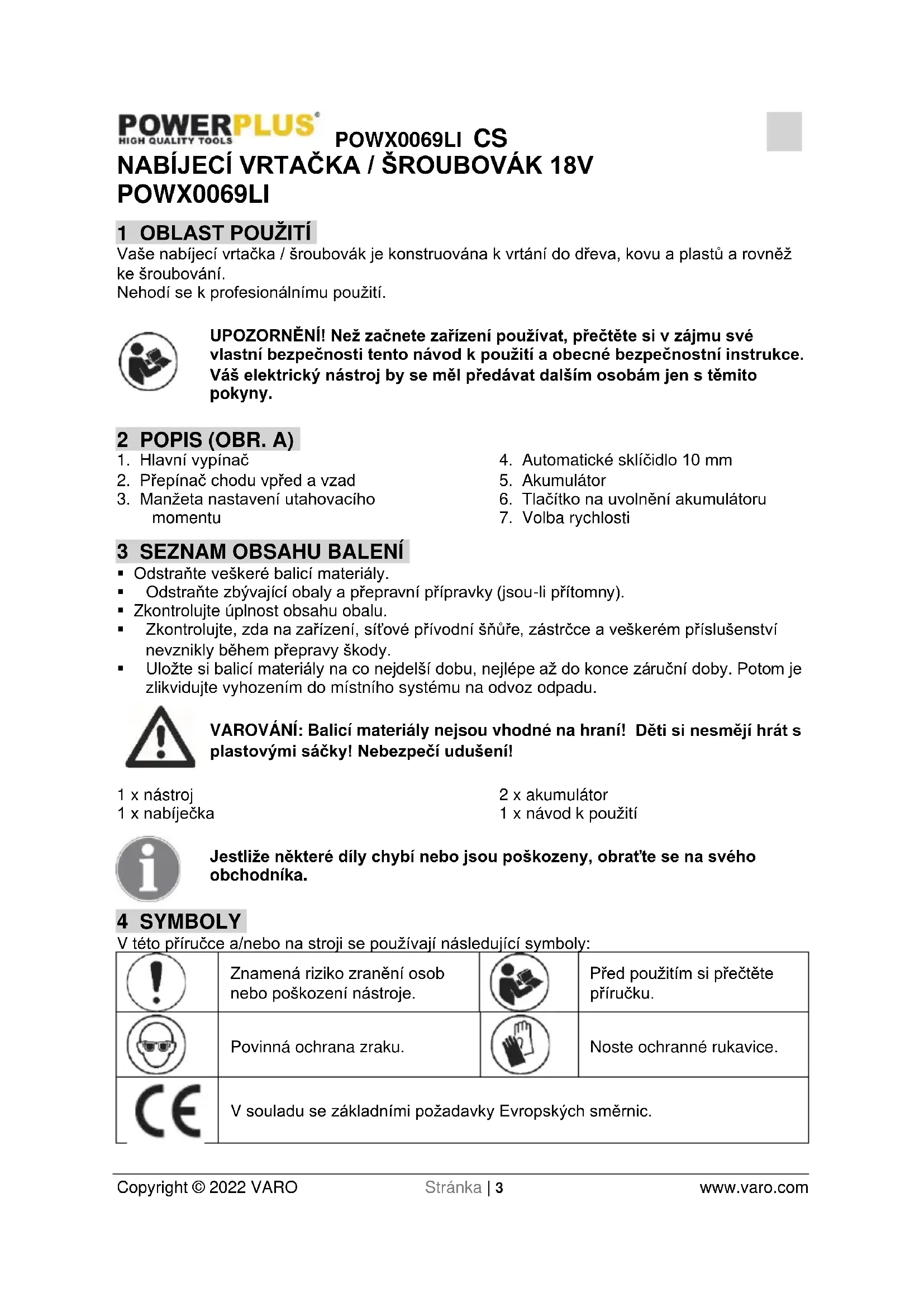 Držitel technické dokumentace: Philippe Vankerkhove, VARO - Vic. Van Rompuy N.V. Níže podepsaný jedná jménem vedení společnosti, Philippe Vankerkhove Regulativní postupy - Manažer pro dohled nad řádným jednáním 25/10/2021, Lier - BelgiumPOWX0069LI SK Copyright © 2022 VARO S t r a n a | 1 www.varo.com 1 POUŽÍVANIE .................................................................................... 3