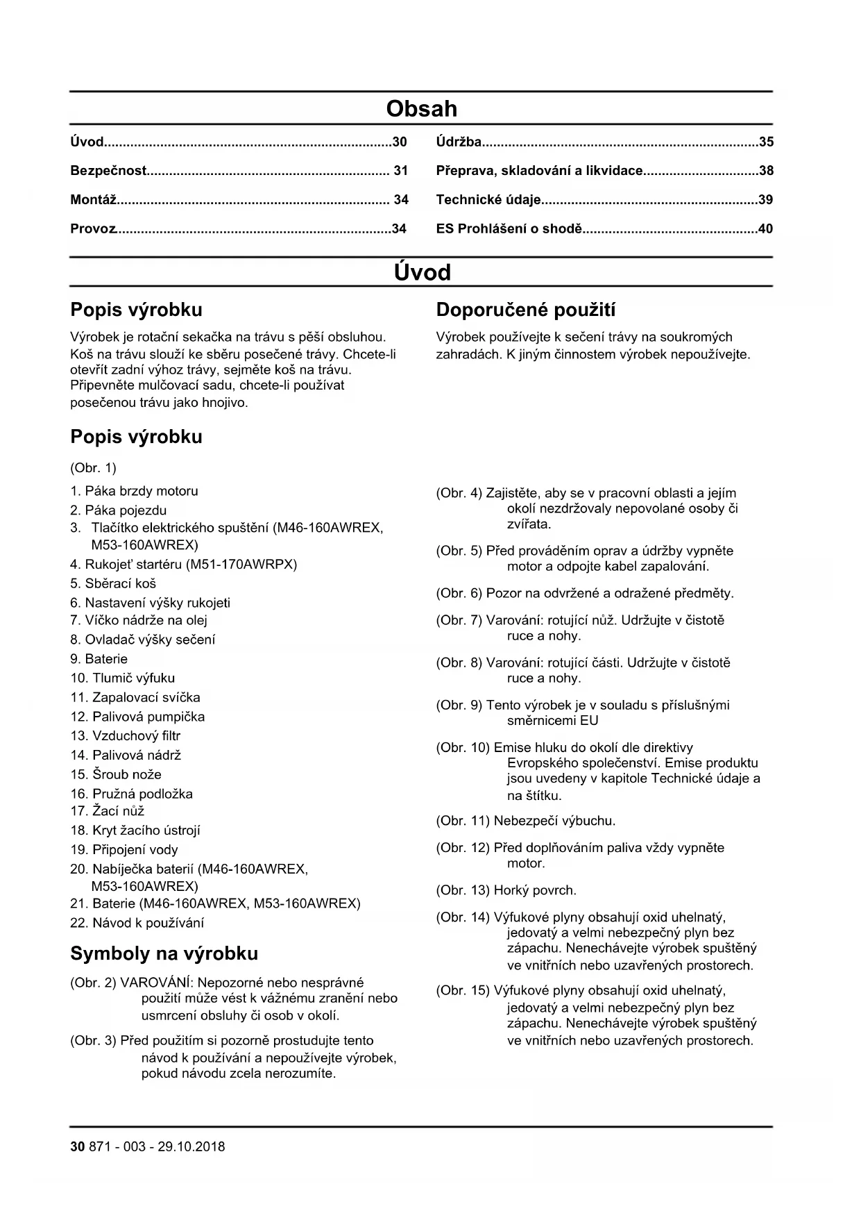 - ES Prohlášení o shodě Úvod Popis výrobku Výrobek je rotační sekačka na trávu s pěší obsluhou. Koš na trávu slouží ke sběru posečené trávy. Chcete-li otevřít zadní výhoz trávy, sejměte koš na trávu. Připevněte mulčovací sadu, chcete-li používat posečenou trávu jako hnojivo. Doporučené použití Výrobek používejte k sečení trávy na soukromých zahradách. K jiným činnostem výrobek nepoužívejte. Popis výrobku (Obr. 1) p. 40