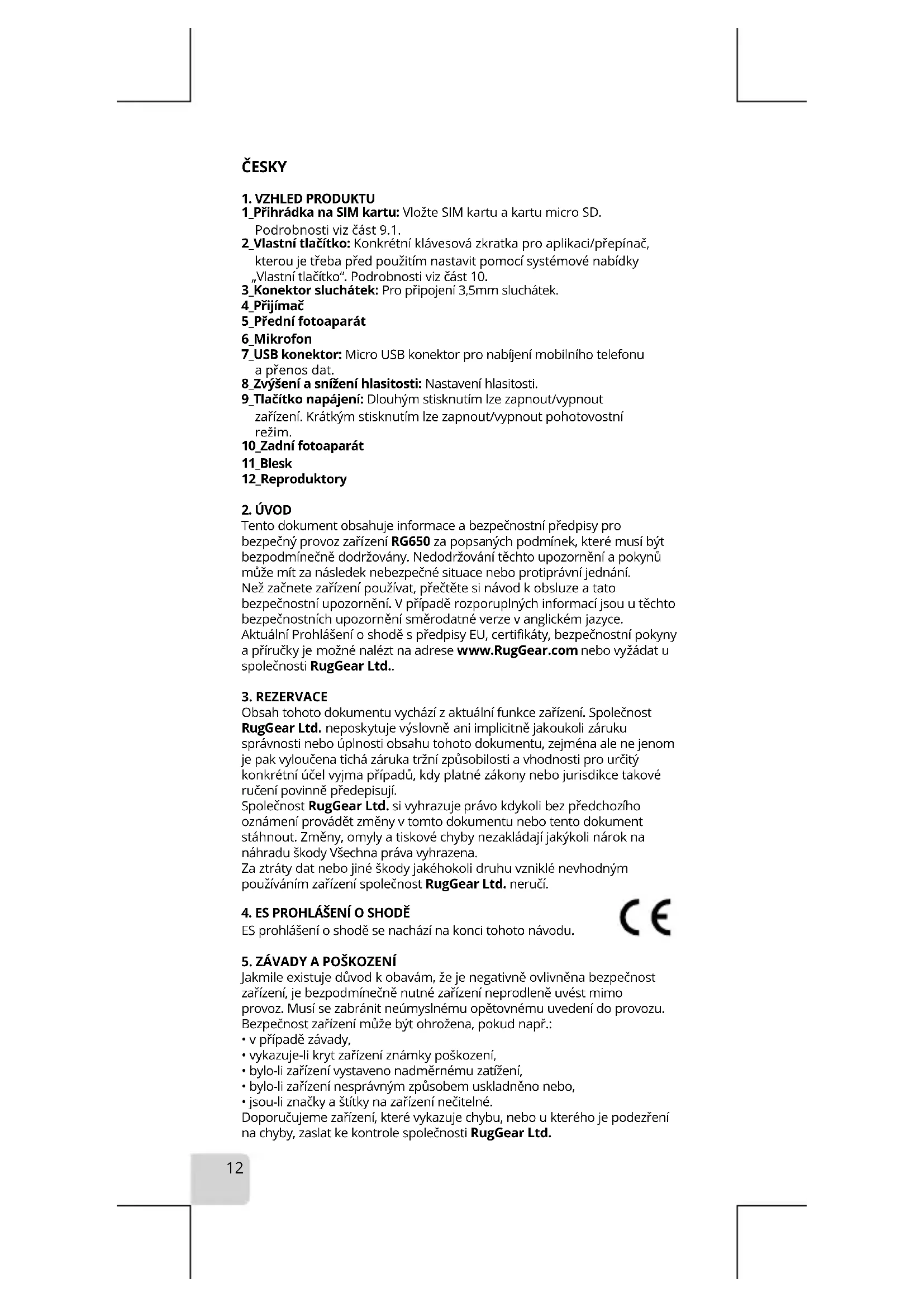 Tento dokument obsahuje informace a bezpečnostní předpisy pro bezpečný provoz zařízení RG650 za popsaných podmínek, které musí být bezpodmínečně dodržovány. Nedodržování těchto upozornění a pokynů může mít za následek nebezpečné situace nebo protiprávní jednání. Než začnete zařízení používat, přečtěte si návod k obsluze a tato bezpečnostní upozornění. V případě rozporuplných informací jsou u těchto bezpečnostních upozornění směrodatné verze v anglickém jazyce. Aktuální Prohlášení o shodě s předpisy EU, certifikáty, bezpečnostní pokyny a příručky je možné nalézt na adrese www.RugGear.com nebo vyžádat u společnosti RugGear Ltd..