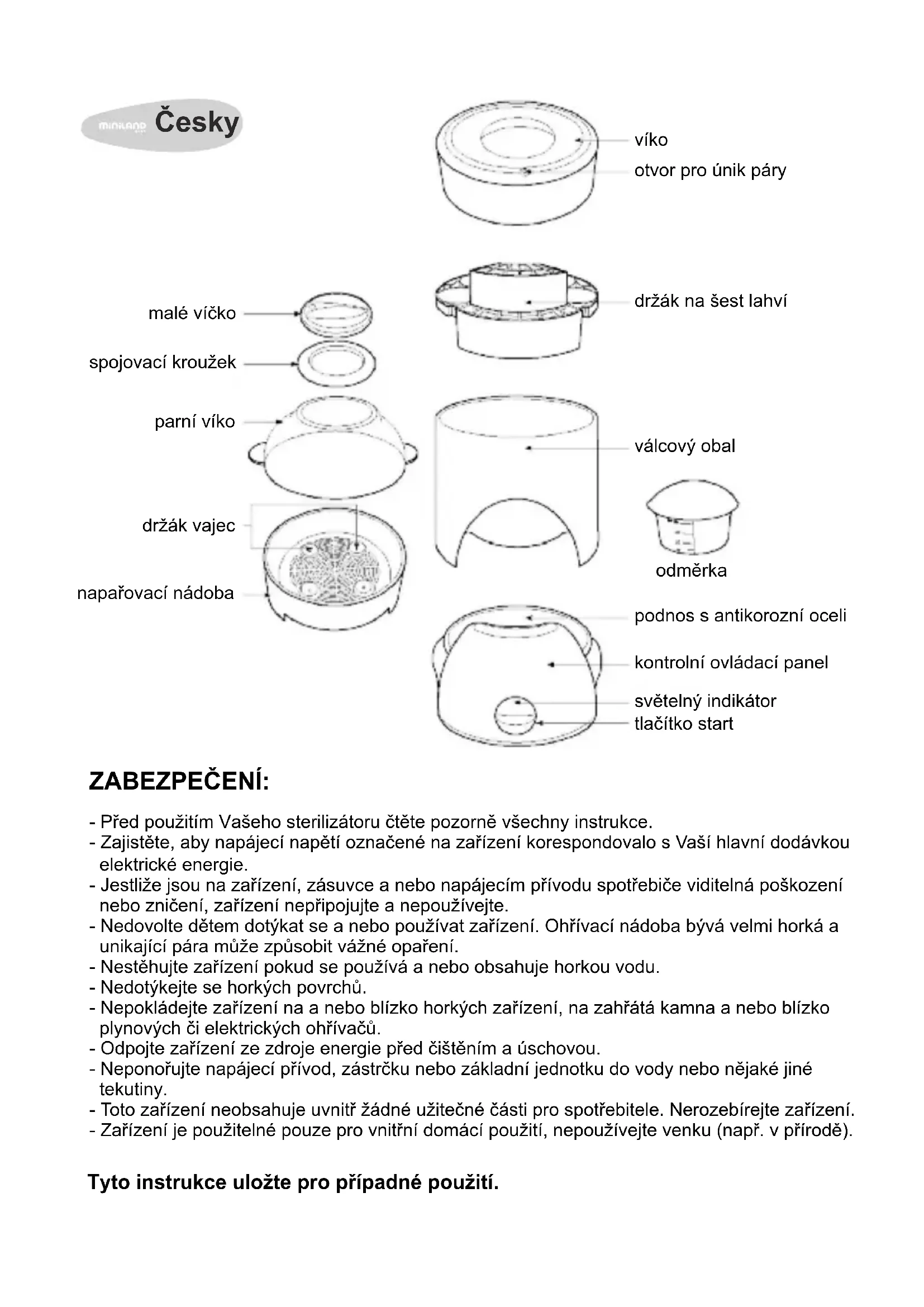 - Non utilizzi prodotti abrasivi o solventi. Questi prodotti possono danneggiare il funzionamento dell' apparecchio e la superficie del recipiente riscaldatore. Caratteristiche elettriche Voltaggio: 230VAC 50/60Hz Potenza: 300W Attenzione: L'apparecchio deve essere collegato a terra.- Před použitím Vašeho sterilizátoru čtěte pozorně všechny instrukce. - Zajistěte, aby napájecí napětí označené na zařízení korespondovalo s Vaší hlavní dodávkou elektrické energie. - Jestliže jsou na zařízení, zásuvce a nebo napájecím přívodu spotřebiče viditelná poškození nebo zničení, zařízení nepřipojujte a nepoužívejte. - Nedovolte dětem dotýkat se a nebo používat zařízení. Ohřívací nádoba bývá velmi horká a unikající pára může způsobit vážné opaření. - Nestěhujte zařízení pokud se používá a nebo obsahuje horkou vodu. - Nedotýkejte se horkých povrchů. - Nepokládejte zařízení na a nebo blízko horkých zařízení, na zahřátá kamna a nebo blízko plynových či elektrických ohřívačů. - Odpojte zařízení ze zdroje energie před čištěním a úschovou. - Neponořujte napájecí přívod, zástrčku nebo základní jednotku do vody nebo nějaké jiné tekutiny. - Toto zařízení neobsahuje uvnitř žádné užitečné části pro spotřebitele. Nerozebírejte zařízení. - Zařízení je použitelné pouze pro vnitřní domácí použití, nepoužívejte venku (např. v přírodě). malé víčko spojovací kroužek parní víko držák vajec napařovací nádoba víko otvor pro únik páry držák na šest lahví válcový obal odměrka podnos s antikorozní oceli kontrolní ovládací panel světelný indikátor tlačítko start ZABEZPEČENÍ: Tyto instrukce uložte pro případné použití. ČeskyINSTRUKCE OVLÁDÁNÍ: Ohřívač lahví: