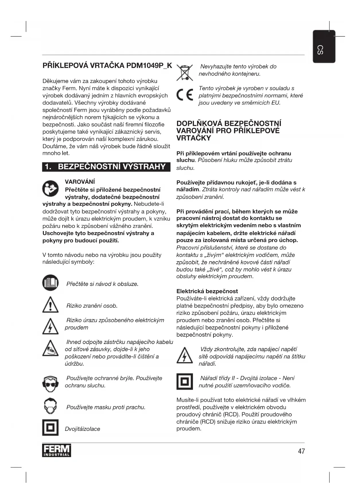 PŘÍKLEPOVÁ VRTAČKA PDM1049P_K Děkujeme vám za zakoupení tohoto výrobku značky Ferm. Nyní máte k dispozici vynikající výrobek dodávaný jedním z hlavních evropských dodavatelů. Všechny výrobky dodávané společností Ferm jsou vyráběny podle požadavků nejnáročnějších norem týkajících se výkonu a bezpečnosti. Jako součást naší firemní filozofie poskytujeme také vynikající zákaznický servis, který je podporován naší komplexní zárukou. Doufáme, že vám náš výrobek bude řádně sloužit mnoho let.