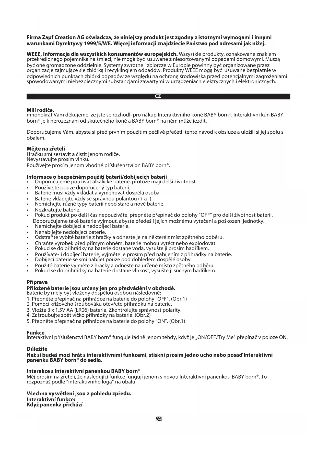 - Kdyžposadíšpanenkunakoně,kůňserozjede.Uslyšíšjakklušeasoučasněřehtá. Režim úspory energie: KdyžsinebudešsInteraktivnímkoněmBABYborn®hrátvícenež2minuty,přepnese narežimúsporyenergie.AbyseInteraktivníkůňBABYborn®znovuspustil,stisknijednouchoneboposaďTvoji panenku BABY born® do sedla. Přepínač Try Me: Prokrátkouukázkurůznýchzvukovýchfunkcíafunkcipohybukoněstisknipravéucho. RežimTryMefungujeřádně,kdyžje“ON/OFF/TryMe”přepínačvpoziciTryMe. Potřebujete-li další informace, obdržíte je nawww.zapf-creation.cz(nutnéinternetovéspojení). Čištění InteraktivnípříslušenstvíBABYborn®lzečistitvlhkým(nemokrým)hadříkem.Zajistěteprosím,abydoelektroniky apřihrádkynabaterienevniklavlhkost. Zapf Creation AG tímto prohlašuje, že tento produkt je ve shodě se základními požadavky a dalšími příslušnými ustanoveními směrnice 1999/5/EC. Další informace obdržíte na níže uvedených adresách Zapf Creation. Likvidace dle Směrnice o OEEZ (odpady z elektrických a elektronických zařízení ) Všechnyvýrobkyoznačenésymbolempřeškrtnutéhokontejnerunaodpadkysenesmívyhazovatspolusostatním netříděnýmodpademzdomácnosti,alejenutnéjelikvidovatsamostatně.Organizacepověřenérecyklacík tomuzřídilytzv.místazpětnéhoodběru,kdejsoubezplatněodebíránystarépřístrojezdomácností.Elektrická aelektronickázařízení(EEZ)abateriemohouobsahovatmateriály,součástialátky,kterémohoupředstavovat nebezpečíproživotníprostředínebozdravíčlověka,pokudnejsouzlikvidoványsprávně.