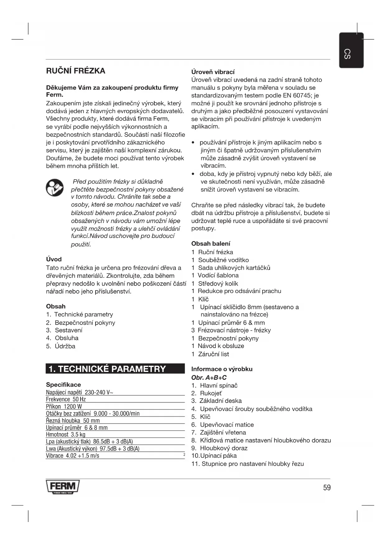 Děkujeme Vám za zakoupení produktu firmy Ferm. Zakoupením jste získali jedinečný výrobek, který dodává jeden z hlavných evropských dodavatelů. Všechny produkty, které dodává firma Ferm, se vyrábí podle nejvyšších výkonnostních a bezpečnostních standardů. Součástí naší filozofie je i poskytování prvotřídního zákaznického servisu, který je zajištěn naší komplexní zárukou. Doufáme, že budete moci používat tento výrobek během mnoha příštích let. Před použitím frézky si důkladně přečtěte bezpečnostní pokyny obsažené v tomto návodu. Chráníte tak sebe a osoby, které se mohou nacházet ve vaší blízkosti během práce.Znalost pokynů obsažených v návodu vám umožní lépe využít možnosti frézky a ulehčí ovládání funkcí.Návod uschovejte pro budoucí použití. Úvod Tato ruční frézka je určena pro frézování dřeva a dřevěných materiálů. Zkontrolujte, zda během přepravy nedošlo k uvolnění nebo poškození částí nářadí nebo jeho příslušenství. Obsah