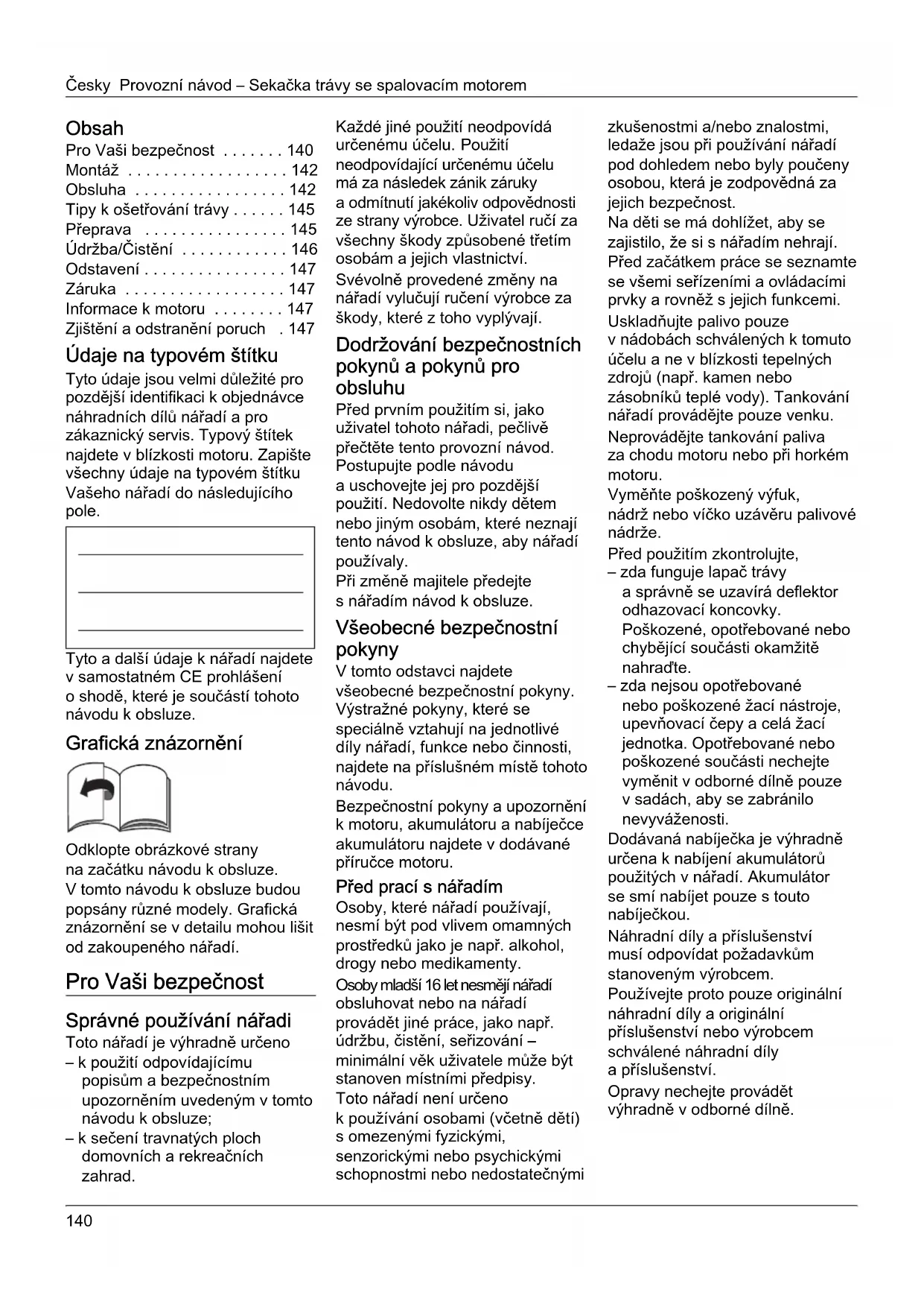 - Informace k motoru Zjištění a odstranění poruch . 147 Údaje na typovém štítku Tyto údaje jsou velmi důležité pro pozdější identifikaci k objednávce náhradních dílů nářadí a pro zákaznický servis. Typový štítek najdete v blízkosti motoru. Zapište všechny údaje na typovém štítku Vašeho nářadí do následujícího pole. Tyto a další údaje k nářadí najdete v samostatném CE prohlášení o shodě, které je součástí tohoto návodu k obsluze. Grafická znázornění Odklopte obrázkové strany na začátku návodu k obsluze. V tomto návodu k obsluze budou popsány různé modely. Grafická znázornění se v detailu mohou lišit od zakoupeného nářadí. Pro Vaši bezpečnost Správné používání nářadi Toto nářadí je výhradně určeno – k použití odpovídajícímu popisům a bezpečnostním upozorněním uvedeným v tomto návodu k obsluze; – k sečení travnatých ploch domovních a rekreačních zahrad. Každé jiné použití neodpovídá určenému účelu. Použití neodpovídající určenému účelu má za následek zánik záruky a odmítnutí jakékoliv odpovědnosti ze strany výrobce. Uživatel ručí za všechny škody způsobené třetím osobám a jejich vlastnictví. Svévolně provedené změny na nářadí vylučují ručení výrobce za škody, které z toho vyplývají. Dodržování bezpečnostních pokynů a pokynů pro obsluhu Před prvním použitím si, jako uživatel tohoto nářadi, pečlivě přečtěte tento provozní návod. Postupujte podle návodu a uschovejte jej pro pozdější použití. Nedovolte nikdy dětem nebo jiným osobám, které neznají tento návod k obsluze, aby nářadí používaly. Při změně majitele předejte s nářadím návod k obsluze. Všeobecné bezpečnostní pokyny V tomto odstavci najdete všeobecné bezpečnostní pokyny. Výstražné pokyny, které se speciálně vztahují na jednotlivé díly nářadí, funkce nebo činnosti, najdete na příslušném místě tohoto návodu. Bezpečnostní pokyny a upozornění k motoru, akumulátoru a nabíječce akumulátoru najdete v dodávané příručce motoru. Před prací s nářadím Osoby, které nářadí používají, nesmí být pod vlivem omamných prostředků jako je např. alkohol, drogy nebo medikamenty. Osoby mladší 16 let nesmějí nářadí obsluhovat nebo na nářadí provádět jiné práce, jako např. údržbu, čistění, seřizování – minimální věk uživatele může být stanoven místními předpisy. Toto nářadí není určeno k používání osobami (včetně dětí) s omezenými fyzickými, senzorickými nebo psychickými schopnostmi nebo nedostatečnými zkušenostmi a/nebo znalostmi, ledaže jsou při používání nářadí pod dohledem nebo byly poučeny osobou, která je zodpovědná za jejich bezpečnost. Na děti se má dohlížet, aby se zajistilo, že si s nářadím nehrají. Před začátkem práce se seznamte se všemi seřízeními a ovládacími prvky a rovněž s jejich funkcemi. Uskladňujte palivo pouze v nádobách schválených k tomuto účelu a ne v blízkosti tepelných zdrojů (např. kamen nebo zásobníků teplé vody). Tankování nářadí provádějte pouze venku. Neprovádějte tankování paliva za chodu motoru nebo při horkém motoru. Vyměňte poškozený výfuk, nádrž nebo víčko uzávěru palivové nádrže. Před použitím zkontrolujte, – zda funguje lapač trávy a správně se uzavírá deflektor odhazovací koncovky. Poškozené, opotřebované nebo chybějící součásti okamžitě nahraďte. – zda nejsou opotřebované nebo poškozené žací nástroje, upevňovací čepy a celá žací jednotka. Opotřebované nebo poškozené součásti nechejte vyměnit v odborné dílně pouze v sadách, aby se zabránilo nevyváženosti. Dodávaná nabíječka je výhradně určena k nabíjení akumulátorů použitých v nářadí. Akumulátor se smí nabíjet pouze s touto nabíječkou. Náhradní díly a příslušenství musí odpovídat požadavkům stanoveným výrobcem. Používejte proto pouze originální náhradní díly a originální příslušenství nebo výrobcem schválené náhradní díly a příslušenství. Opravy nechejte provádět výhradně v odborné dílně.Provozní návod – Sekačka trávy se spalovacím motorem Česky p. 147