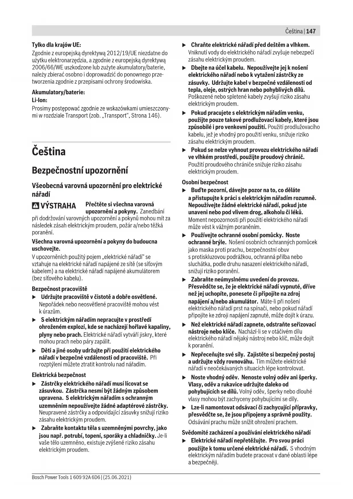 Úroveň vibrací uvedená vtěchto pokynech byla změřena pomocí normované měřicí metody alze ji použít pro vzájemné porovnání elektronářadí. Hodí se ipro předběžný odhad zatížení vibracemi. Uvedená úroveň vibrací reprezentuje hlavní použití elektronářadí. Pokud se ovšem bude elektronářadí používat pro jiné práce, sjinými nástroji nebo snedostatečnou údržbou, může se úroveň vibrací lišit. To může zatížení vibracemi po celou pracovní dobu zřetelně zvýšit. Pro přesný odhad zatížení vibracemi by měly být zohledněny idoby, kdy je nářadí vypnuté nebo sice běží, ale fakticky se nepoužívá. To může zatížení vibracemi po celou pracovní dobu zřetelně snížit. Stanovte dodatečná bezpečnostní opatření kochraně obsluhy před účinky vibrací, jako je např. údržba elektronářadí anástrojů, udržování teplých rukou, organizace pracovních procesů. Montáž Nabíjení akumulátoru u Používejte pouze nabíječky uvedené vtechnických údajích. Jen tyto nabíječky jsou přizpůsobené pro lithium-iontový akumulátor používaný svaším elektronářadím. Upozornění: Akumulátor se dodává částečně nabitý. Aby byl zaručen plný výkon akumulátoru, před prvním použitím akumulátor úplně nabijte vnabíječce. Lithium-iontový akumulátor lze nabíjet kdykoli, aniž by se tím zkrátila životnost. Přerušení procesu nabíjení nepoškozuje akumulátor. Bosch Power Tools 1 609 92A 6D6 | (25.06.2021)152 | Čeština Lithium-iontový akumulátor je díky „Electronic Cell Protection (ECP)“ chráněný proti hlubokému vybití. Při vybitém akumulátoru ochranná funkce vypne elektrické nářadí: Nástroj se již nepohybuje. u Po automatickém vypnutí elektronářadí už nestiskávejte vypínač. Akumulátor se může poškodit. Dodržujte pokyny pro likvidaci. Vyjmutí akumulátoru Pro vyjmutí akumulátoru (6) stiskněte odjišťovací tlačítko (8) aakumulátor vytáhněte zelektrického nářadí. Nepoužívejte přitom násilí. Ukazatel stavu nabití Ukazatel stavu nabití akumulátoru (5) ukáže při napůl nebo úplně stisknutém vypínači (4) na několik sekund stav nabití akumulátoru, skládá se ze tří zelených LED. LED Kapacita Trvale svítí 3 zelené ≥ 66% Trvale svítí 2 zelené 33 – 66% Trvale svítí 1 zelená 11 – 33% Pomalu bliká 1 zelená ≤ 10% Tři LED ukazatele stavu nabití blikají rychle, když je teplota akumulátoru mimo rozsah provozní teploty −30 až +65°C a/nebo zareagovala ochrana proti přetížení. Montáž ochranného zařízení u Před každou prací na elektronářadí (např. údržba, výměna nástrojů) apři jeho přepravě auskladnění vyjměte akumulátor. Při neúmyslném stisknutí vypínače hrozí nebezpečí poranění. Upozornění: Po prasknutí brusného kotouče během provozu nebo při poškození upínacích přípravků na ochranném krytu/ na elektronářadí se musí elektronářadí neprodleně zaslat zákaznickému servisu, adresy viz část „Zákaznická služba a poradenství ohledně použití“. Ochranný kryt pro broušení Nasaďte ochranný kryt (10) pro upínání na elektronářadí tak, aby kódovací výstupky ochranného krytu souhlasily supínáním. Stiskněte adržte přitom stisknutou odjišťovací páčku (1). Přitlačte ochranný kryt (10) na krk vřetena tak, aby nákružek ochranného krytu dosedal kpřírubě elektronářadí aotáčejte ochranným krytem, dokud slyšitelně nezaskočí. Nastavte polohu ochranného krytu (10) podle požadavků příslušné práce. Odjišťovací páčku (1) stiskněte nahoru aotočte ochranný kryt (10) do požadované polohy. u Ochranný kryt(10) nastavte vždy tak, aby oba výstupky odjišťovací páčky (1) zapadly do příslušných otvorů vochranném krytu (10). u Ochranný kryt (10) nastavte tak, aby jiskry nelétaly směrem kpracovníkovi. u Ochranným krytem (10) smí být možné otáčet pouze po stisknutí odjišťovací páčky (1)! Vopačném případě se nesmí elektronářadí vžádném případě nadále používat amusí se dát do servisu. Upozornění: Kódovací výstupky na ochranném krytu (10) zabezpečují, že lze namontovat pouze ochranný kryt, který je vhodný pro toto elektronářadí. Ochranný kryt pro dělení u Při dělení sbrusivem spojivem používejte vždy ochranný kryt pro dělení (13). u Při dělení kamene zajistěte dostatečné odsávání prachu. Ochranný kryt pro dělení (13) se montuje stejně jako ochranný kryt pro broušení (10). Odsávací kryt pro dělení svodicími saněmi Odsávací kryt pro dělení svodicími saněmi (24) se montuje stejně jako ochranný kryt pro broušení (10). Přídavná rukojeť u Elektrické nářadí používejte pouze spřídavnou rukojetí (9). Přídavnou rukojeť (9) našroubujte na hlavu převodovky vzávislosti na způsobu práce vpravo nebo vlevo. Přídavná rukojeť stlumením vibrací Přídavnou rukojeť (9) našroubujte na hlavu převodovky vzávislosti na způsobu práce vpravo nebo vlevo. Přídavná rukojeť stlumením vibrací umožňuje přijemnější abezpečnou práci sminimálními vibracemi. 1 609 92A 6D6 | (25.06.2021) Bosch Power ToolsČeština | 153 u Na přídavné rukojeti neprovádějte žádné změny. Poškozenou přídavnou rukojeť dále nepoužívejte. Ochrana rukou u Pro práci sgumovým brusným talířem (19) nebo shrncovým kartáčem/ kotoučovým kartáčem/ vějířovým brusným kotoučem vždy namontujte ochranu rukou (18). Ochranu rukou (18) upevněte pomocí přídavné rukojeti (9). Montáž brusných nástrojů u Před každou prací na elektronářadí (např. údržba, výměna nástrojů) apři jeho přepravě auskladnění vyjměte akumulátor. Při neúmyslném stisknutí vypínače hrozí nebezpečí poranění. u Nedotýkejte se brusných arozbrušovacích kotoučů, dokud nevychladnou