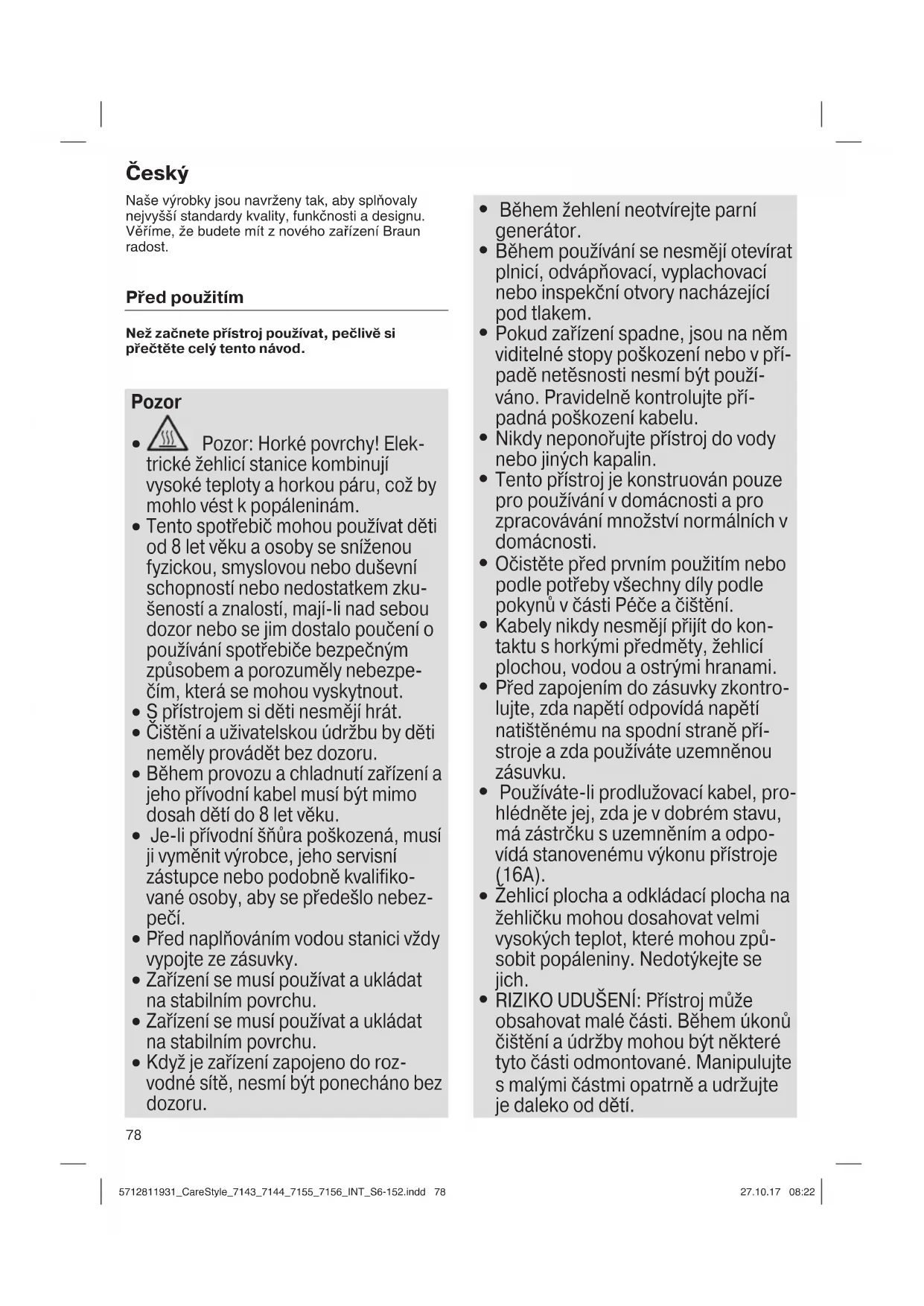 RIZIKO UDUŠENÍ: Přístroj může obsahovat malé části. Během úkonů čištění a údržby mohou být některé tyto části odmontované. Manipulujte s malými částmi opatrně a udržujte je daleko od dětí. 5712811931_CareStyle_7143_7144_7155_7156_INT_S6-152.indd 785712811931_CareStyle_7143_7144_7155_7156_INT_S6-152.indd 78 27.10.17 08:2227.10.17 08:2279