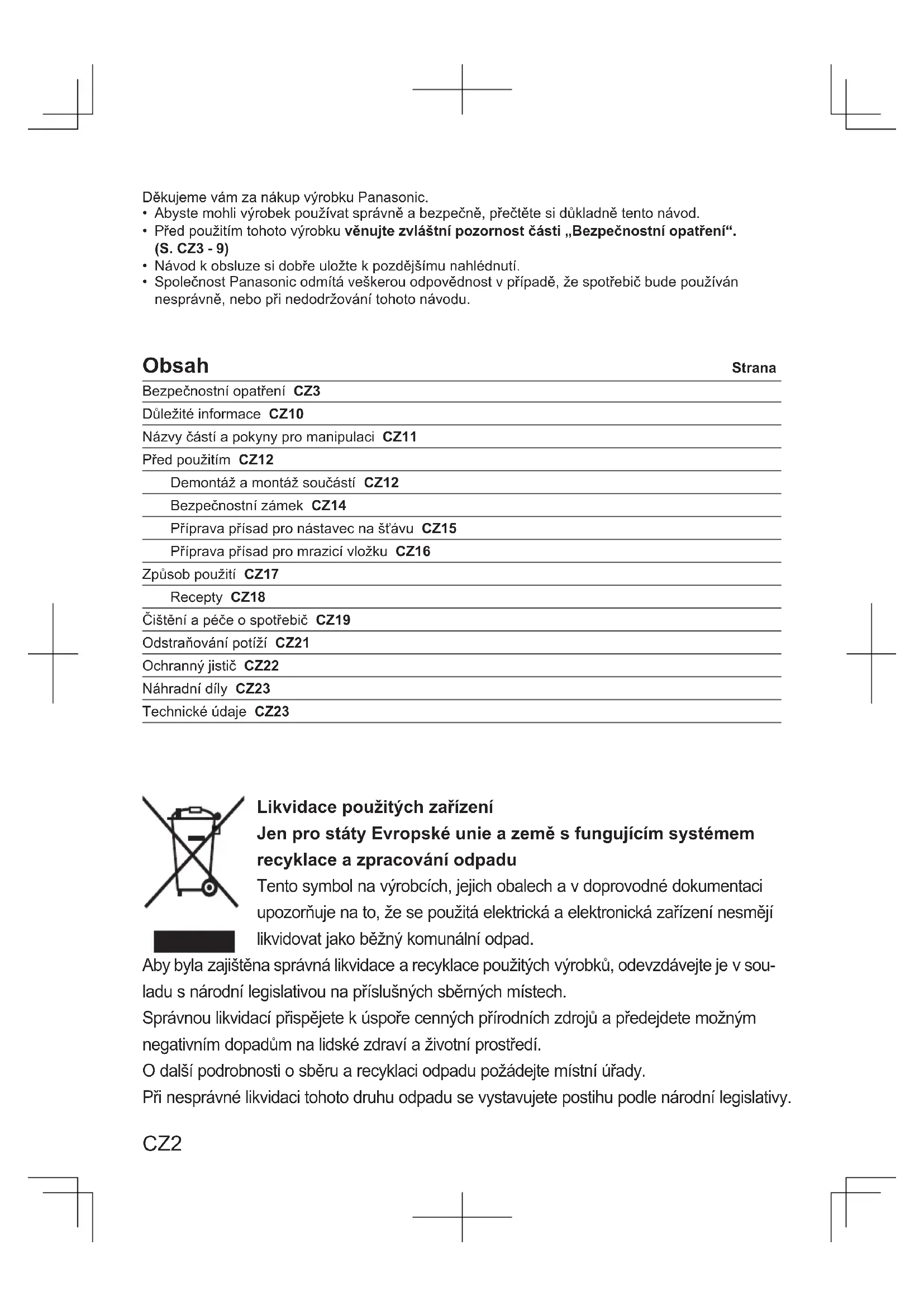 - Společnost Panasonic odmitá veškerou odpovědnost v pripadě, ze spotřebic bude použivan nasprávně, nebo pri nedodžovani tohoto navodu.