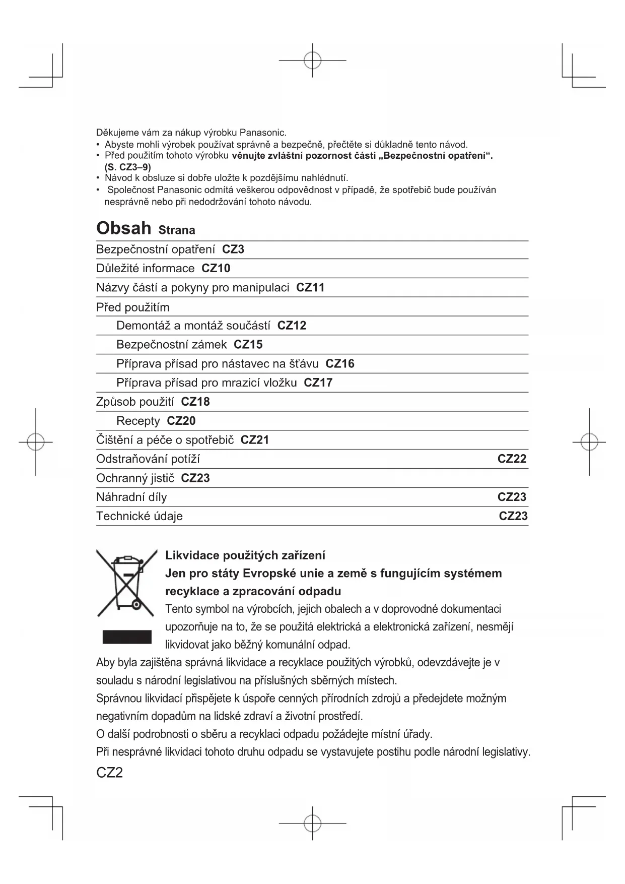 - Společnost Panasonic odmitá veškerou odpovednost v pripadě, ze spotřebic bude použivan nesprávně nebo pri nedodžovani tohoto navodu.