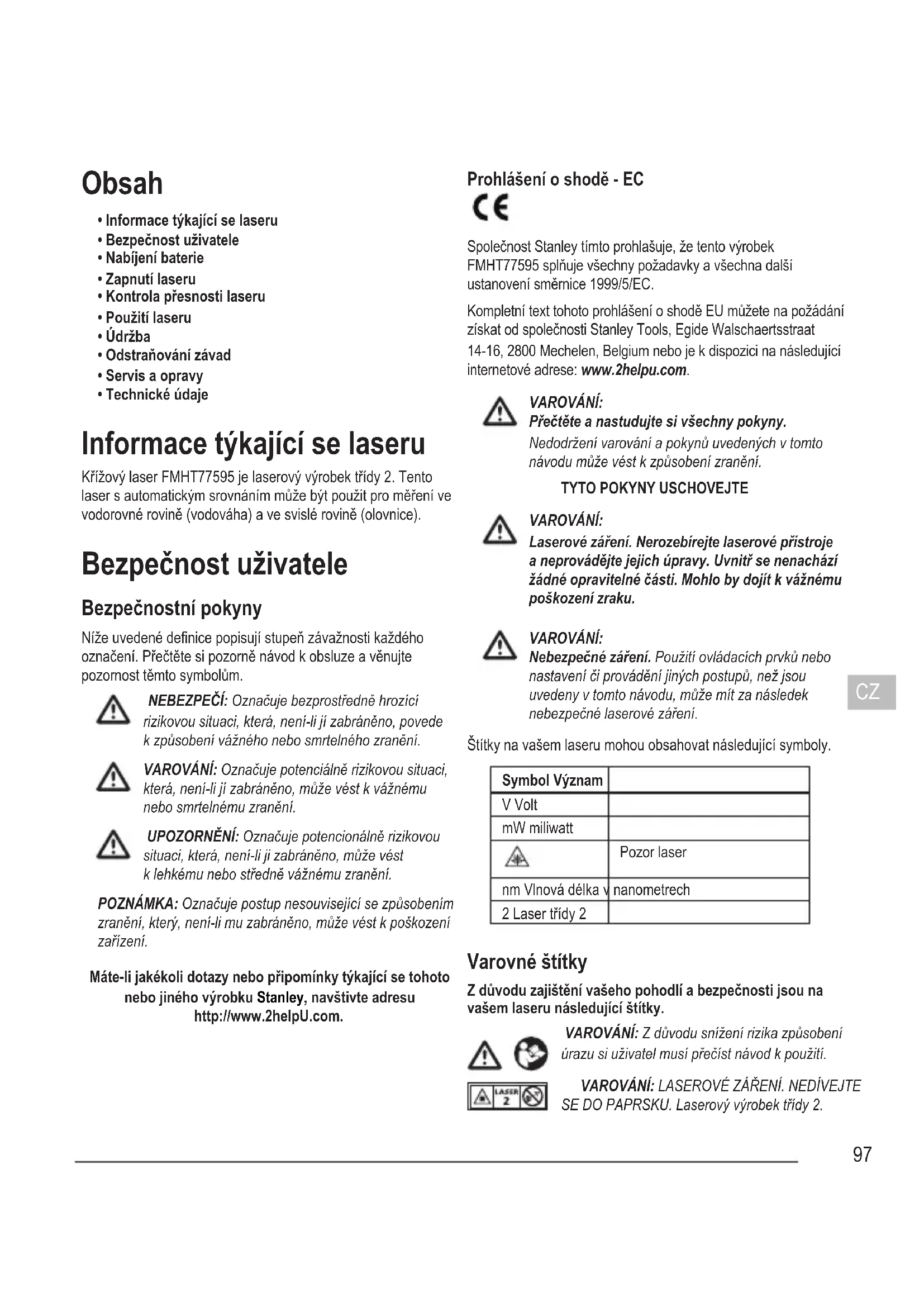 - Technické údaje Informace týkající se laseru Křížový laser FMHT77595 je laserový výrobek třídy 2. Tento laser s automatickým srovnáním může být použit pro měření ve vodorovné rovině (vodováha) a ve svislé rovině (olovnice). Bezpečnost uživatele Bezpečnostní pokyny Níže uvedené denice popisují stupeň závažnosti každého označení. Přečtěte si pozorně návod k obsluze a věnujte pozornost těmto symbolům. NEBEZPEČÍ: Označuje bezprostředně hrozící rizikovou situaci, která, není-li jí zabráněno, povede k způsobení vážného nebo smrtelného zranění. VAROVÁNÍ: Označuje potenciálně rizikovou situaci, která, není-li jí zabráněno, může vést k vážnému nebo smrtelnému zranění. UPOZORNĚNÍ: Označuje potencionálně rizikovou situaci, která, není-li ji zabráněno, může vést k lehkému nebo středně vážnému zranění. POZNÁMKA: Označuje postup nesouvisející se způsobením zranění, který, není-li mu zabráněno, může vést k poškození zařízení. Máte-li jakékoli dotazy nebo připomínky týkající se tohoto nebo jiného výrobku Stanley, navštivte adresu http://www.2helpU.com. Prohlášení o shodě - EC Společnost Stanley tímto prohlašuje, že tento výrobek FMHT77595 splňuje všechny požadavky a všechna další ustanovení směrnice 1999/5/EC. Kompletní text tohoto prohlášení o shodě EU můžete na požádání získat od společnosti Stanley Tools, Egide Walschaertsstraat 14-16, 2800 Mechelen, Belgium nebo je k dispozici na následující internetové adrese: www.2helpu.com. VAROVÁNÍ: Přečtěte a nastudujte si všechny pokyny. Nedodržení varování a pokynů uvedených v tomto návodu může vést k způsobení zranění.