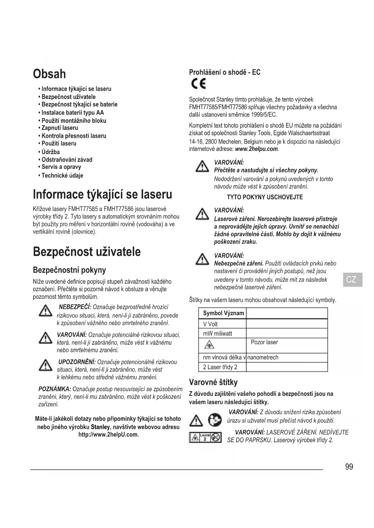 - Technické údaje Informace týkající se laseru Křížové lasery FMHT77585 a FMHT77586 jsou laserové výrobky třídy 2. Tyto lasery s automatickým srovnáním mohou být použity pro měření v horizontální rovině (vodováha) a ve vertikální rovině (olovnice). Bezpečnost uživatele Bezpečnostní pokyny Níže uvedené denice popisují stupeň závažnosti každého označení. Přečtěte si pozorně návod k obsluze a věnujte pozornost těmto symbolům. NEBEZPEČÍ: Označuje bezprostředně hrozící rizikovou situaci, která, není-li jí zabráněno, povede k způsobení vážného nebo smrtelného zranění. VAROVÁNÍ: Označuje potenciálně rizikovou situaci, která, není-li jí zabráněno, může vést k vážnému nebo smrtelnému zranění. UPOZORNĚNÍ: Označuje potencionálně rizikovou situaci, která, není-li ji zabráněno, může vést k lehkému nebo středně vážnému zranění. POZNÁMKA: Označuje postup nesouvisející se způsobením zranění, který, není-li mu zabráněno, může vést k poškození zařízení. Máte-li jakékoli dotazy nebo připomínky týkající se tohoto nebo jiného výrobku Stanley, navštivte webovou adresu http://www.2helpU.com. Prohlášení o shodě - EC Společnost Stanley tímto prohlašuje, že tento výrobek FMHT77585/FMHT77586 splňuje všechny požadavky a všechna další ustanovení směrnice 1999/5/EC. Kompletní text tohoto prohlášení o shodě EU můžete na požádání získat od společnosti Stanley Tools, Egide Walschaertsstraat 14-16, 2800 Mechelen, Belgium nebo je k dispozici na následující internetové adrese: www.2helpu.com. VAROVÁNÍ: Přečtěte a nastudujte si všechny pokyny. Nedodržení varování a pokynů uvedených v tomto návodu může vést k způsobení zranění.