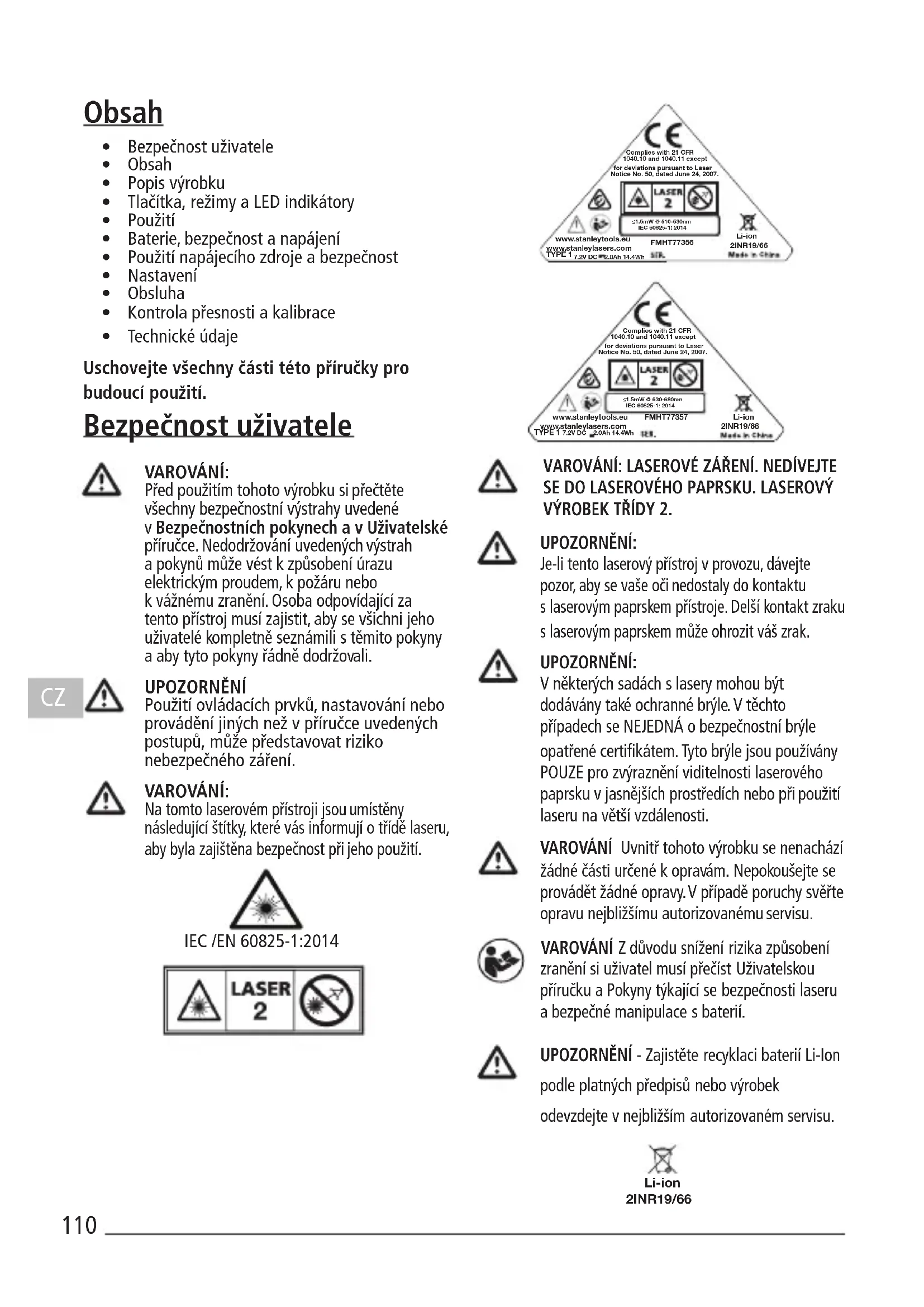 - Tento laserový přístroj nemůže být opravován uživatelem, aproto jej vpřípadě poruchy nebo poškození svěřte prodejci nebo autorizovanému servisu Stanley. Všechny opravy tohoto přístroje musí být prováděny pouze kvalikovaným technikem, který bude používat originální náhradní díly. Tímto způsobem zajistíte stálou bezpečnost výrobku.113