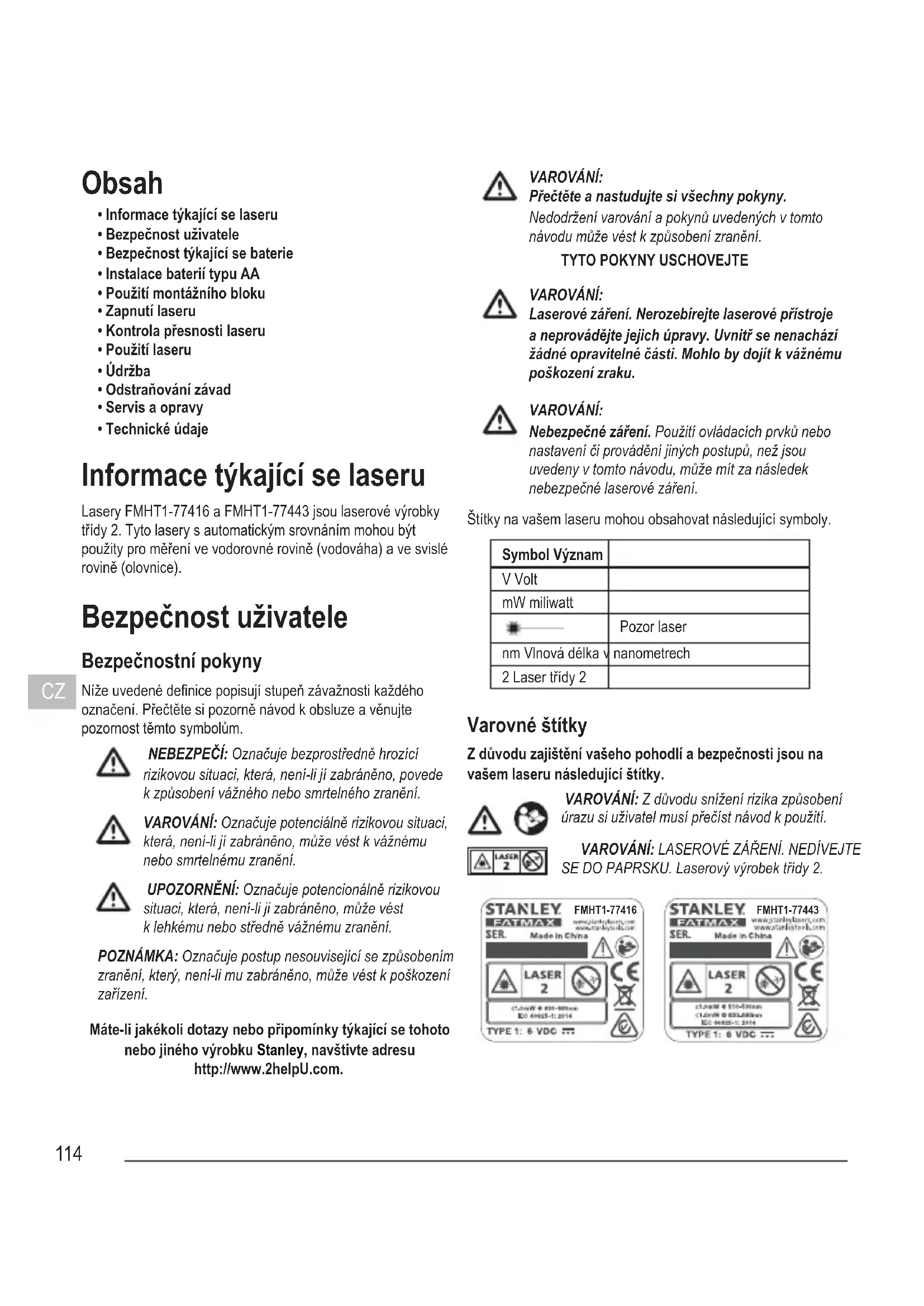 - Technické údaje Informace týkající se laseru Lasery FMHT1-77416 a FMHT1-77443 jsou laserové výrobky třídy 2. Tyto lasery s automatickým srovnáním mohou být použity pro měření ve vodorovné rovině (vodováha) a ve svislé rovině (olovnice). Bezpečnost uživatele Bezpečnostní pokyny Níže uvedené denice popisují stupeň závažnosti každého označení. Přečtěte si pozorně návod k obsluze a věnujte pozornost těmto symbolům. NEBEZPEČÍ: Označuje bezprostředně hrozící rizikovou situaci, která, není-li jí zabráněno, povede k způsobení vážného nebo smrtelného zranění. VAROVÁNÍ: Označuje potenciálně rizikovou situaci, která, není-li jí zabráněno, může vést k vážnému nebo smrtelnému zranění. UPOZORNĚNÍ: Označuje potencionálně rizikovou situaci, která, není-li ji zabráněno, může vést k lehkému nebo středně vážnému zranění. POZNÁMKA: Označuje postup nesouvisející se způsobením zranění, který, není-li mu zabráněno, může vést k poškození zařízení. Máte-li jakékoli dotazy nebo připomínky týkající se tohoto nebo jiného výrobku Stanley, navštivte adresu http://www.2helpU.com. VAROVÁNÍ: Přečtěte a nastudujte si všechny pokyny. Nedodržení varování a pokynů uvedených v tomto návodu může vést k způsobení zranění.