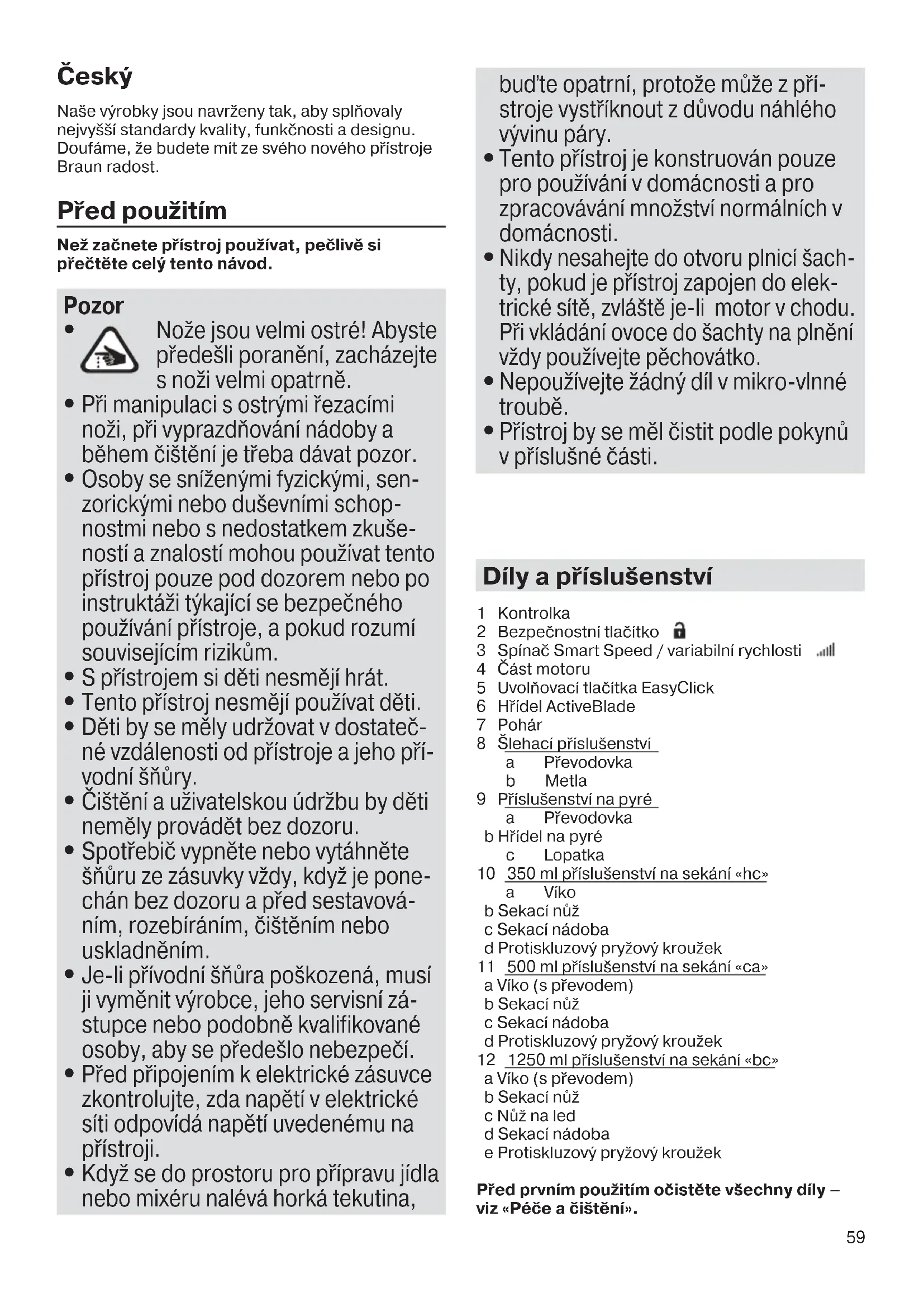 Přístroj by se měl čistit podle pokynů v příslušné části. Díly a příslušenství 1 Kontrolka 2 Bezpečnostní tlačítko 3 Spínač Smart Speed / variabilní rychlosti 4 Část motoru 5 Uvolňovací tlačítka EasyClick 6 Hřídel ActiveBlade 7 Pohár 8 Šlehací příslušenství a Převodovka b Metla 9 Příslušenství na pyré a Převodovka b Hřídel na pyré c Lopatka 10 350 ml příslušenství na sekání «hc» a Víko b Sekací nůž c Sekací nádoba d Protiskluzový pryžový kroužek 11 500 ml příslušenství na sekání «ca» a Víko (s převodem) b Sekací nůž c Sekací nádoba d Protiskluzový pryžový kroužek 12 1250 ml příslušenství na sekání «bc» a Víko (s převodem) b Sekací nůž c Nůž na led d Sekací nádoba e Protiskluzový pryžový kroužek Před prvním použitím očistěte všechny díly – viz «Péče a čištění». 5722112414_MQ9045X_INT_S6-116.indd 59 17.10.16 11:2160 Kontrolka Kontrolka (1) ukazuje stav přístroje, je-li zapojený do elektrické zásuvky. Kontrolka Pʼnístroj / provozní stav Blikající ȏervená Pȱístroj je pȱipravený k použití. Trvale zelená Pȱístroj je uvolnȓný (uvolȩovací tlaȏítko spínaȏe je stisknuté) a lze jej zapnout. Trvale ȏervená Vȏasná výstraha pȱed pȱehȱátím. Motor krok za krokem zpomaluje až do vypnutí. Nechte pȱístroj vychladnout. Je znovu pȱipravený k použití, když kontrolka bliká ȏervenȓ. Pokud se maximální rychlost sníží pod vysokým zatížením a dlouhou dobou chodu, můžete stále dokončit přípravu, avšak poté byste měli nechat přístroj vychladnout. Jak používat přístroj Spínač Smart Speed pro variabilní rychlosti Jedno stisknutí, všechny rychlosti. Čím více stisknete, tím vyšší je rychlost. Čím vyšší je rychlost, tím rychlejší a jemnější jsou výsledky mixování a sekání. Obsluha jednou rukou: spínač Smart Speed (3) umožňuje zapnout přístroj a ovládat rychlost jednou rukou. Obsluha ručního mixéru První použití: Odstraňte přepravní pojistku z části motoru (4) zatažením za červený pásek. Zapnutí (A) Přístroj je opatřený bezpečnostním tlačítkem pro uvolnění spínače Smart Speed. Pro bezpečné zapnutí se řiďte následujícími body: