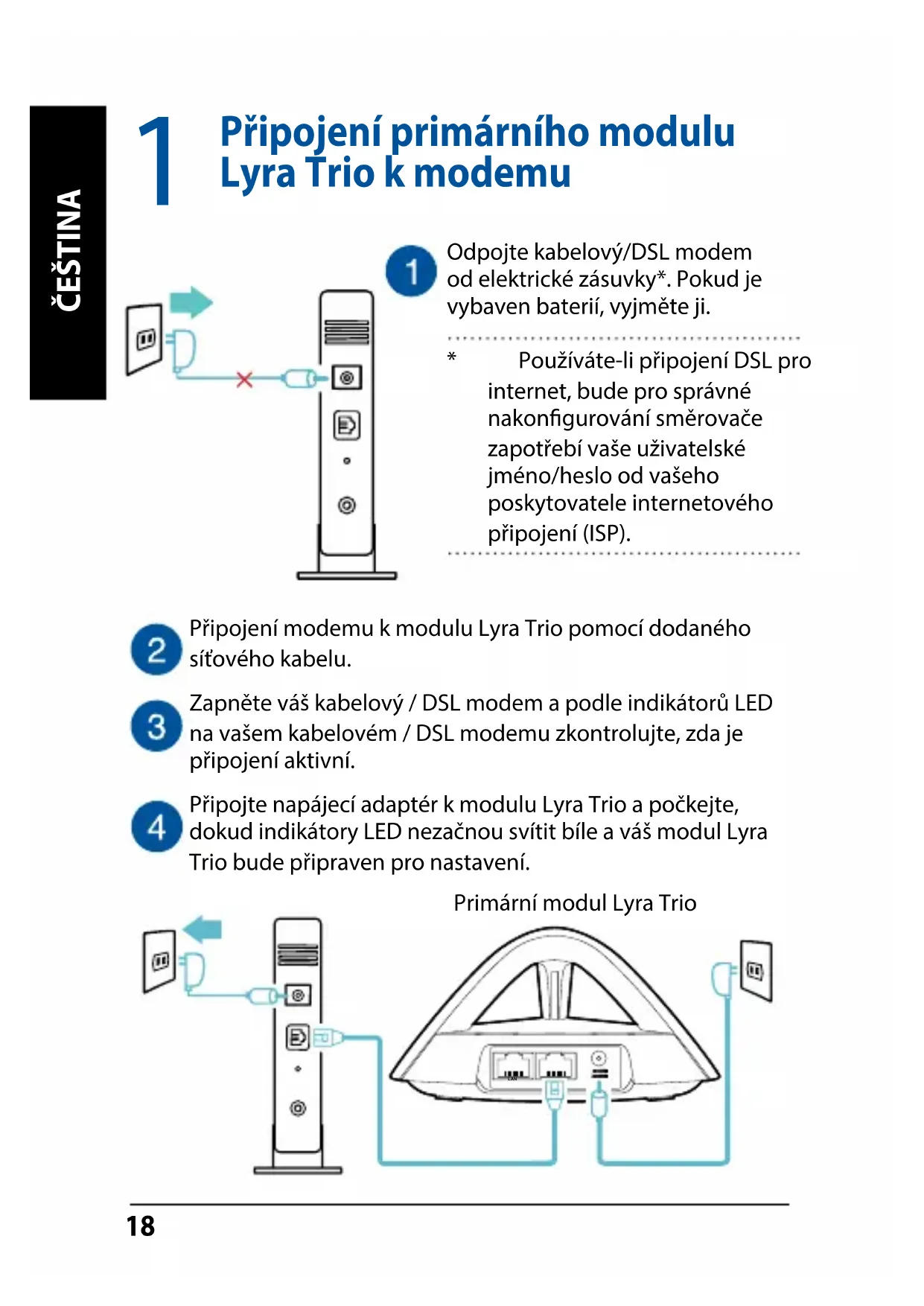 Připojení modemu k modulu Lyra Trio pomocí dodaného síťového kabelu.Odpojte kabelový/DSL modem od elektrické zásuvky*. Pokud je vybaven baterií, vyjměte ji.* Používáte-li připojení DSL pro internet, bude pro správné nakongurování směrovače zapotřebí vaše uživatelské jméno/heslo od vašeho poskytovatele internetového připojení (ISP).Zapněte váš kabelový / DSL modem a podle indikátorů LED na vašem kabelovém / DSL modemu zkontrolujte, zda je připojení aktivní. Připojte napájecí adaptér k modulu Lyra Trio a počkejte, dokud indikátory LED nezačnou svítit bíle a váš modul Lyra Trio bude připraven pro nastavení. LAN Primární modul Lyra Trio19 ČEŠTINA Nastavení vašeho Wi-Fi systému Lyra Trio Spusťte aplikaci ASUS Lyra na svém mobilním zařízení a postupujte podle pokynů.