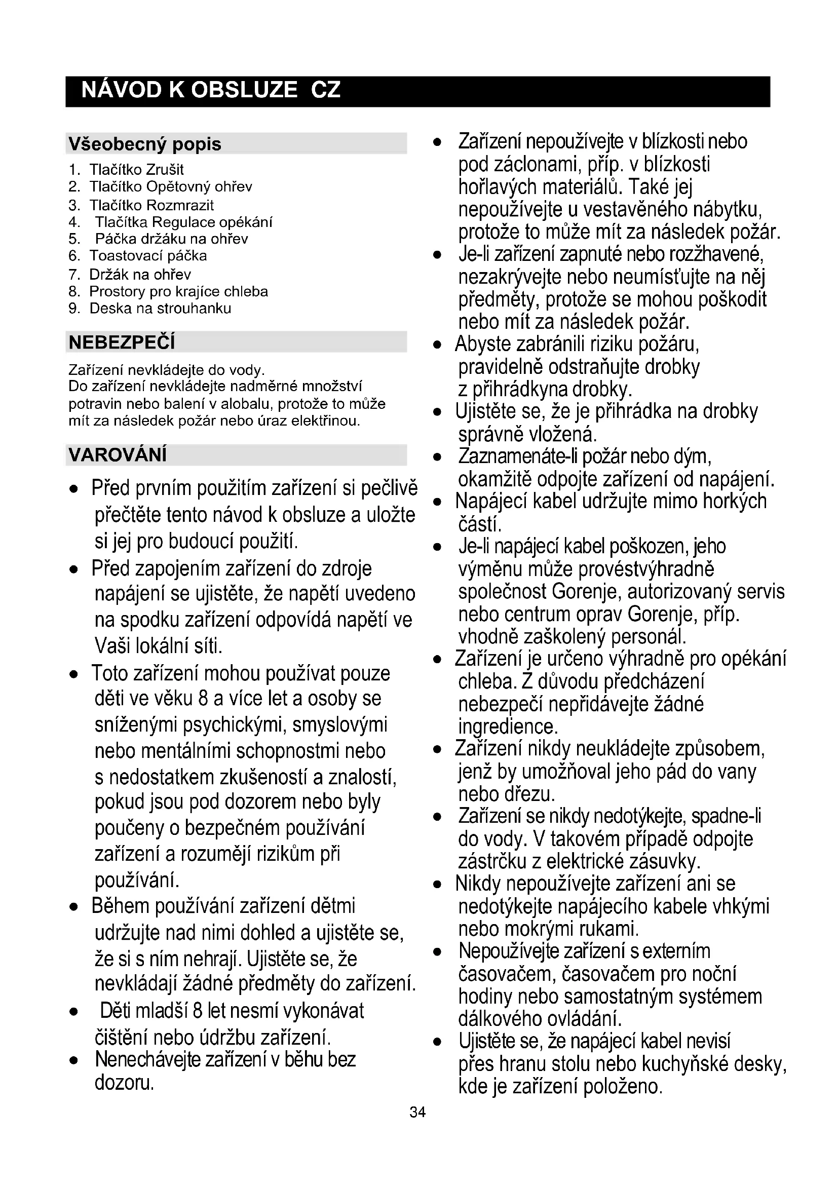 - Zařízení je určeno výhradně pro opékání chleba. Z důvodu předcházení nebezpečí nepřidávejte žádné ingredience.