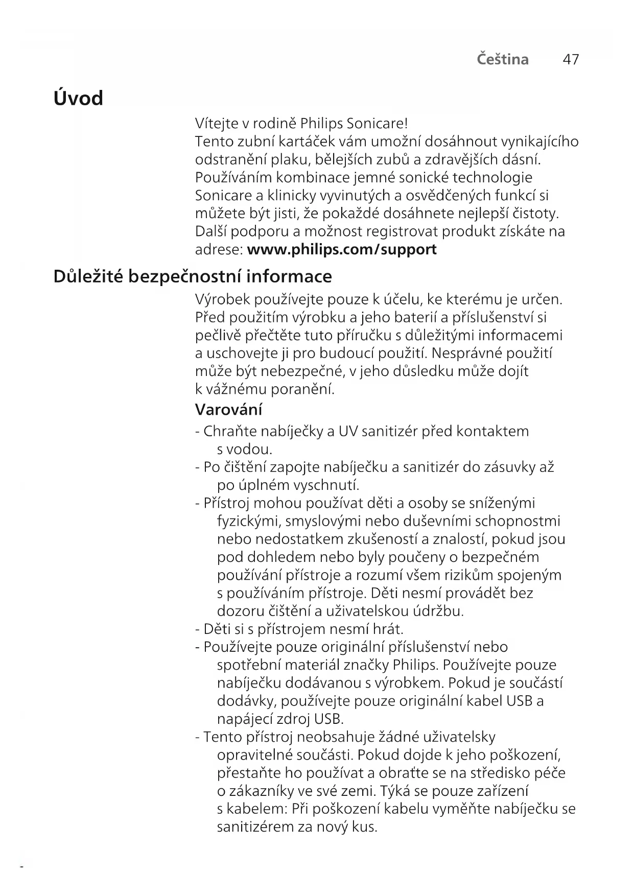 Čeština Úvod Vítejte vrodině Philips Sonicare! Tento zubní kartáček vám umožní dosáhnout vynikajícího odstranění plaku, bělejších zubů azdravějších dásní. Používáním kombinace jemné sonické technologie Sonicare aklinicky vyvinutých aosvědčených funkcí si můžete být jisti, že pokaždé dosáhnete nejlepší čistoty. Další podporu amožnost registrovat produkt získáte na adrese: www.philips.com/support Důležité bezpečnostní informace Výrobek používejte pouze kúčelu, ke kterému je určen. Před použitím výrobku ajeho baterií apříslušenství si pečlivě přečtěte tuto příručku sdůležitými informacemi auschovejte ji pro budoucí použití. Nesprávné použití může být nebezpečné, vjeho důsledku může dojít kvážnému poranění. Varování - Chraňte nabíječky a UV sanitizér před kontaktem svodou. - Po čištění zapojte nabíječku a sanitizér dozásuvky až po úplném vyschnutí. - Přístroj mohou používat děti a osoby se sníženými fyzickými, smyslovými nebo duševními schopnostmi nebo nedostatkem zkušeností a znalostí, pokud jsou pod dohledem nebo byly poučeny obezpečném používání přístroje a rozumí všem rizikům spojeným spoužíváním přístroje. Děti nesmí provádět bez dozoru čištění auživatelskou údržbu. - Děti si spřístrojem nesmí hrát. - Používejte pouze originální příslušenství nebo spotřební materiál značky Philips. Používejte pouze nabíječku dodávanou svýrobkem. Pokud je součástí dodávky, používejte pouze originální kabel USB a napájecí zdroj USB. - Tento přístroj neobsahuje žádné uživatelsky opravitelné součásti. Pokud dojde kjeho poškození, přestaňte ho používat a obraťte se na středisko péče ozákazníky ve své zemi. Týká se pouze zařízení skabelem: Při poškození kabelu vyměňte nabíječku se sanitizérem za nový kus.48 Čeština - Nepoužívejte nabíječku asanitizér ve venkovním prostoru ani blízko horkých povrchů. - Žádné díly výrobku nemyjte vmyčce nádobí. - Tento přístroj je určen pouze kčištění zubů, dásní ajazyka. - Sanitizér vždy udržujte mimo dosah dětí. - Pokud UV výbojka svítí ipři otevřených dvířkách, ukončete používání sanitizér. UV záření může poškodit lidský zrak a pokožku. - Sanitizér používejte pouze s nasazenou ochrannou clonou. - Nedotýkejte se horké UV žárovky UV sanitizéru. - Jsou-li vlákna na hlavici kartáčku poškozená nebo ohnutá, přestaňte hlavici používat. Hlavici kartáčku měňte každé 3měsíce nebo – pokud se objeví známky opotřebení – ičastěji. - Produkt nesmí přijít do přímého kontaktu sprodukty, které obsahují esenciální oleje nebo kokosový olej. Kontakt může způsobit uvolnění vláken. - Přestaňte přístroj používat a poraďte se se svým zubním lékařem / lékařem, pokud po použití dojde k nadměrnému krvácení, pokud krvácení přetrvá i po jednom týdnu používání nebo pokud zaznamenáte nepříjemné pocity nebo bolest. - Pokud jste vposledních 2měsících podstoupili operaci zubu či dásní, poraďte se před použitím přístroje se svým zubním lékařem. - Pokud máte kardiostimulátor nebo jiné implantované zařízení, poraďte se slékařem nebo svýrobcem implantovaného zařízení, než přístroj použijete. - Máte-li zdravotní pochybnosti, obraťte se před použitím přístroje na svého lékaře. - Tento přístroj je určen kosobní péči, nikoli províce pacientů ve stomatologické ordinaci nebo instituci. Bezpečnostní pokyny týkající se baterií - Tento přístroj obsahuje baterie, jejichž výměnu smí provádět pouze kvalifikovaná osoba.49 Čeština - Výrobek používejte pouze kúčelu, ke kterému je určen. Před použitím výrobku ajeho baterií apříslušenství si pečlivě přečtěte tuto příručku sinformacemi auschovejte ji pro budoucí použití. Nesprávné použití může být nebezpečné, vjeho důsledku může dojít kvážnému poranění. Dodané příslušenství se může pro různé výrobky lišit. - Používejte pouze originální příslušenství aspotřební materiál značky Philips. Používejte pouze odnímatelnou napájecí jednotku TCBxxxx, HX6100, HX6110, HX6160 nebo WAAxxxx. - Výrobek abaterie uchovávejte mimo dosah ohně anevystavujte je přímému slunečnímu záření ani vysokým teplotám. - Pokud se výrobek nenormálně zahřeje, vydává zápach, změní barvu nebo pokud nabíjení trvá mnohem déle než obvykle, přestaňte výrobek používat nebo nabíjet aobraťte se na společnost Philips. - Nedávejte výrobky ani jejich baterie do mikrovlnné trouby ani na indukční sporáky. - Výrobek ani baterie nesmíte otevírat, upravovat, propíchnout, poškodit ani demontovat. Mohli byste tak způsobit přehřívání baterií nebo uvolnění toxických či nebezpečných látek. Baterie nezkratujte; dobíjecí baterie nenabíjejte přes limit ani je nenabíjejte vobrácené polaritě. - Přístroj obsahuje baterie, které nejsou určeny kvýměně. Když dosáhne baterie konce své životnosti, je nutné zařízení řádně zlikvidovat, viz část týkající se recyklace. - Pokud jsou baterie poškozené nebo znich uniká jakákoli látka, vyhněte se kontaktu takové baterie skůží nebo očima. Pokud by kněčemu takovému došlo, příslušné místo oplachujte vodou avyhledejte lékařskou pomoc. - Při manipulaci sbateriemi se ujistěte, že máte suché ruce aže výrobek ibaterie jsou suché.50 Čeština - Zabraňte nezáměrnému zkratování baterií po jejich vyjmutí zvýrobku: nedovolte, aby se póly baterie dostaly do kontaktu skovovými předměty (mince, sponky, prsteny). Nebalte baterie do hliníkové fólie. Před likvidací póly baterií přelepte páskou nebo je umístěte do plastového sáčku. - Výrobek nabíjejte, používej