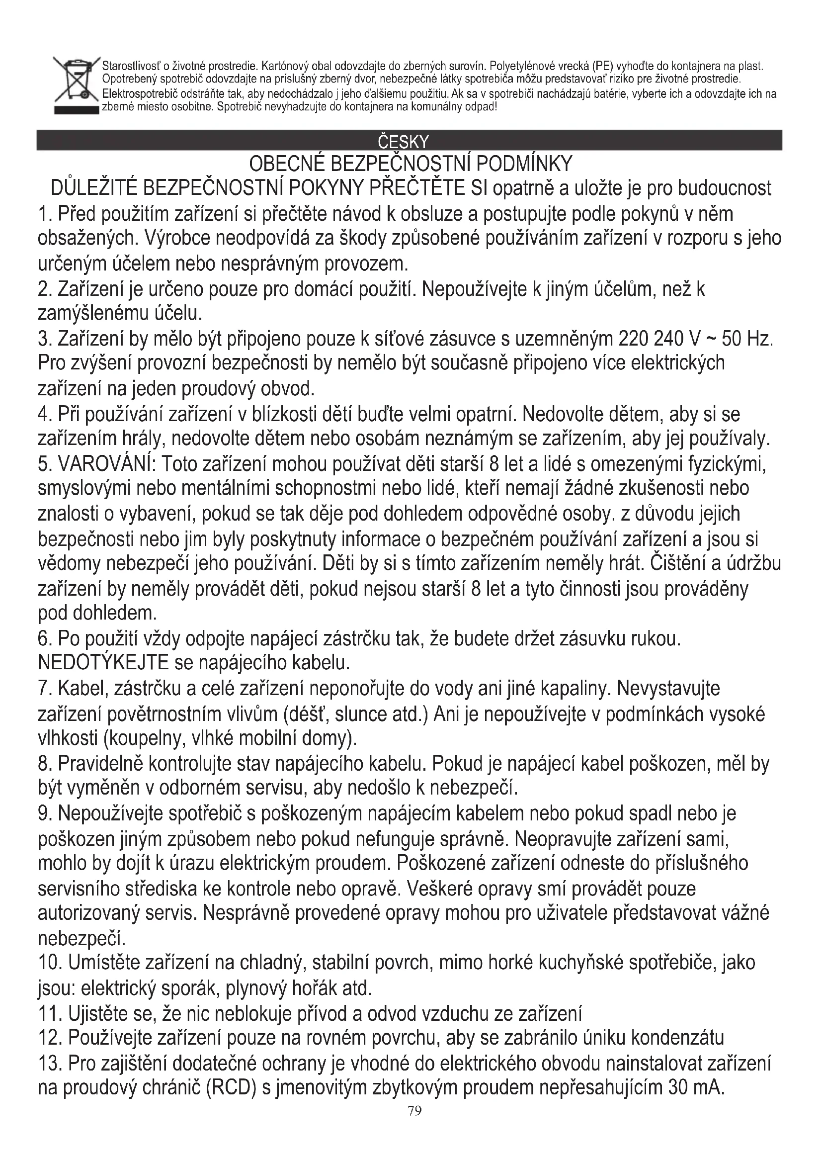 na proudový chránič (RCD) s jmenovitým zbytkovým proudem nepřesahujícím 30 mA. ČESKY Starostlivosť o životné prostredie. Kartónový obal odovzdajte do zberných surovín. Polyetylénové vrecká (PE) vyhoďte do kontajnera na plast. Opotrebený spotrebič odovzdajte na príslušný zberný dvor, nebezpečné látky spotrebiča môžu predstavovať riziko pre životné prostredie. Elektrospotrebič odstráňte tak, aby nedochádzalo j jeho ďalšiemu použitiu. Ak sa v spotrebiči nachádzajú batérie, vyberte ich a odovzdajte ich na zberné miesto osobitne. Spotrebič nevyhadzujte do kontajnera na komunálny odpad! 7915. Po vypnutí zařízení vyčkejte alespoň 5 minut, než jej znovu zapnete.