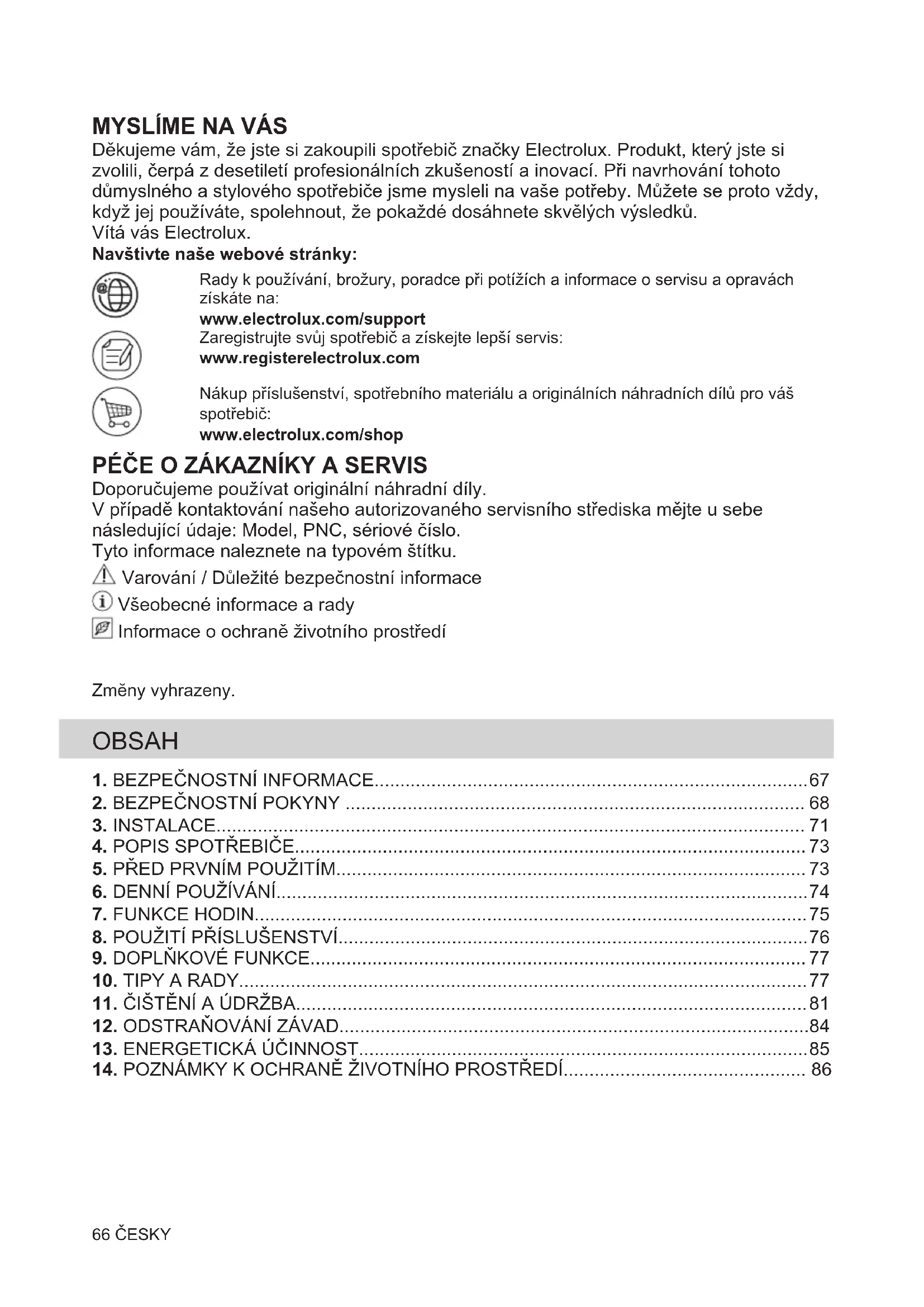 Děkujeme vám, že jste si zakoupili spotřebič značky Electrolux. Produkt, který jste si zvolili, čerpá z desetiletí profesionálních zkušeností a inovací. Při navrhování tohoto důmyslného a stylového spotřebiče jsme mysleli na vaše potřeby. Můžete se proto vždy, když jej používáte, spolehnout, že pokaždé dosáhnete skvělých výsledků. Vítá vás Electrolux. Navštivte naše webové stránky: Rady k používání, brožury, poradce při potížích a informace o servisu a opravách získáte na: www.electrolux.com/support Zaregistrujte svůj spotřebič a získejte lepší servis: www.registerelectrolux.com Nákup příslušenství, spotřebního materiálu a originálních náhradních dílů pro váš spotřebič: www.electrolux.com/shop PÉČE O ZÁKAZNÍKY A SERVIS Doporučujeme používat originální náhradní díly. V případě kontaktování našeho autorizovaného servisního střediska mějte u sebe následující údaje: Model, PNC, sériové číslo. Tyto informace naleznete na typovém štítku. Varování / Důležité bezpečnostní informace Všeobecné informace a rady Informace o ochraně životního prostředí Zmĕny vyhrazeny. OBSAH