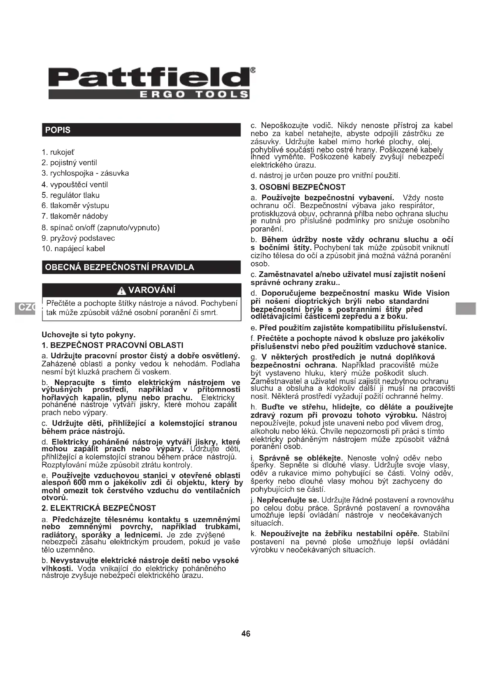 - Vždy doržujte všechna bezpečnostní pravidla doporucěna vyrobcem vaseho vzduchového nastroje a navic i všechna bezpečnostní pravidla vzduchové stanice. Omezite tak riziko urazu vázného urazu.