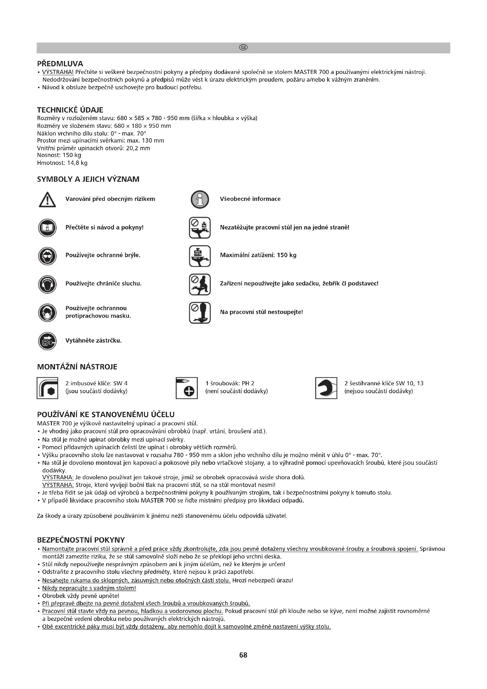 2 imbusové klíče: SW 4 (jsou součástí dodávky) 1 šroubovák: PH 2 (není součástí dodávky) 2 šestihranné klíče SW 10, 13 (nejsou součástí dodávky) POUŽÍVÁNÍ KE STANOVENÉMU ÚČELU MASTER 700 je výškově nastavitelný upínací a pracovní stůl.