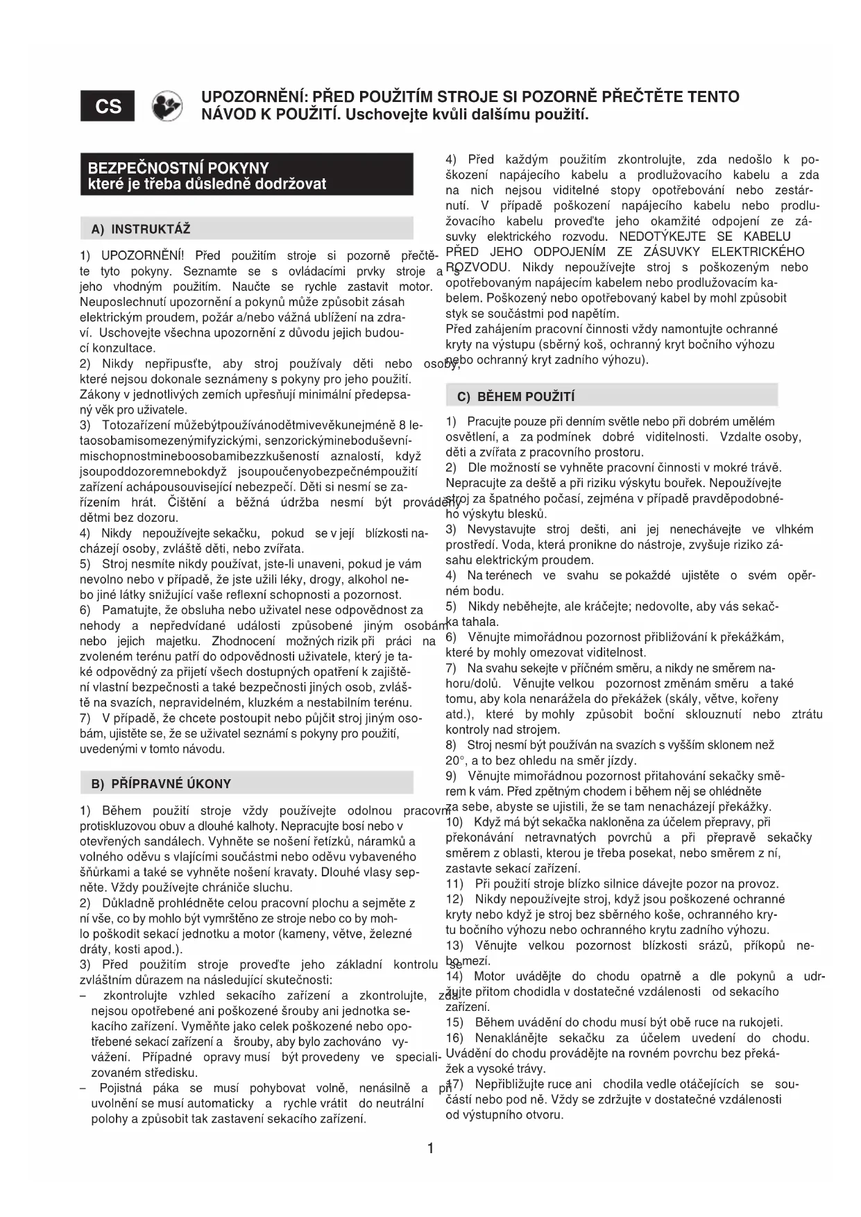 1) Během použití stroje vždy používejte odolnou pracovní protiskluzovou obuv a dlouhé kalhoty. Nepracujte bosí nebo v otevřených sandálech. Vyhněte se nošení řetízků, náramků a volného oděvu s vlajícími součástmi nebo oděvu vybaveného šňůrkami a také se vyhněte nošení kravaty. Dlouhé vlasy sep- něte. Vždy používejte chrániče sluchu. 2) Důkladně prohlédněte celou pracovní plochu a sejměte z ní vše, co by mohlo být vymrštěno ze stroje nebo co by moh- lo poškodit sekací jednotku a motor (kameny, větve, železné dráty, kosti apod.). 3) Před použitím stroje proveďte jeho základní kontrolu se zvláštním důrazem na následující skutečnosti: – zkontrolujte vzhled sekacího zařízení a zkontrolujte, zda nejsou opotřebené ani poškozené šrouby ani jednotka se- kacího zařízení. Vyměňte jako celek poškozené nebo opo- třebené sekací zařízení a šrouby, aby bylo zachováno vy- vážení. Případné opravy musí být provedeny ve speciali- zovaném středisku. – Pojistná páka se musí pohybovat volně, nenásilně a při uvolnění se musí automaticky a rychle vrátit do neutrální polohy a způsobit tak zastavení sekacího zařízení.