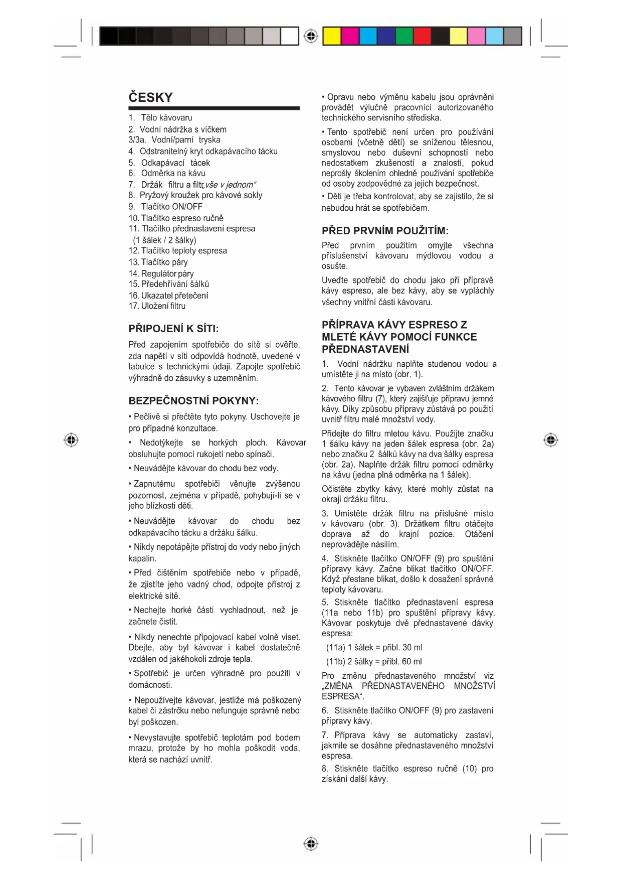 PŘEDNASTAVENÍ“. Stiskněte tlačítko espreso ručně (10) pro spuštění přípravy kávy. Pro zastavení protékání kávy opět stiskněte (10). POZOR: Nepokoušejte se uvolnit držák filtru, když je stlačeno tlačítko (10) nebo tlačítko (11). Vzhledem k tomu, že má kávovar systém samočinného plnění, neprovádí se žádný zvláštní postup, když v nádržce dojde voda, nebo po delším období, kdy se kávovar nepoužíval.
