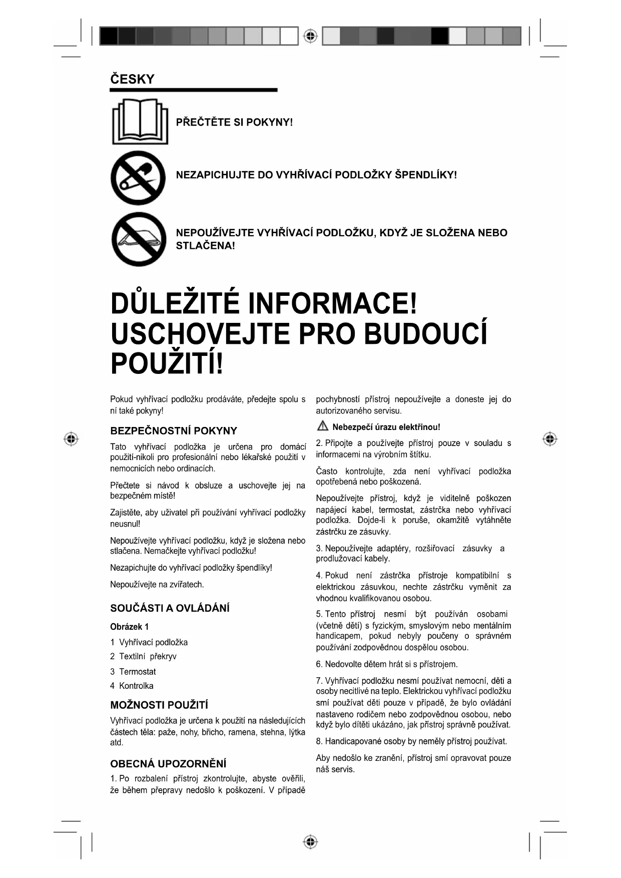 Tato vyhřívací podložka je určena pro domácí použití-nikoli pro profesionální nebo lékařské použití v nemocnicích nebo ordinacích. Přečtete si návod k obsluze a uschovejte jej na bezpečném místě! Zajistěte, aby uživatel při používání vyhřívací podložky neusnul! Nepoužívejte vyhřívací podložku, když je složena nebo stlačena. Nemačkejte vyhřívací podložku! Nezapichujte do vyhřívací podložky špendlíky! Nepoužívejte na zvířatech.