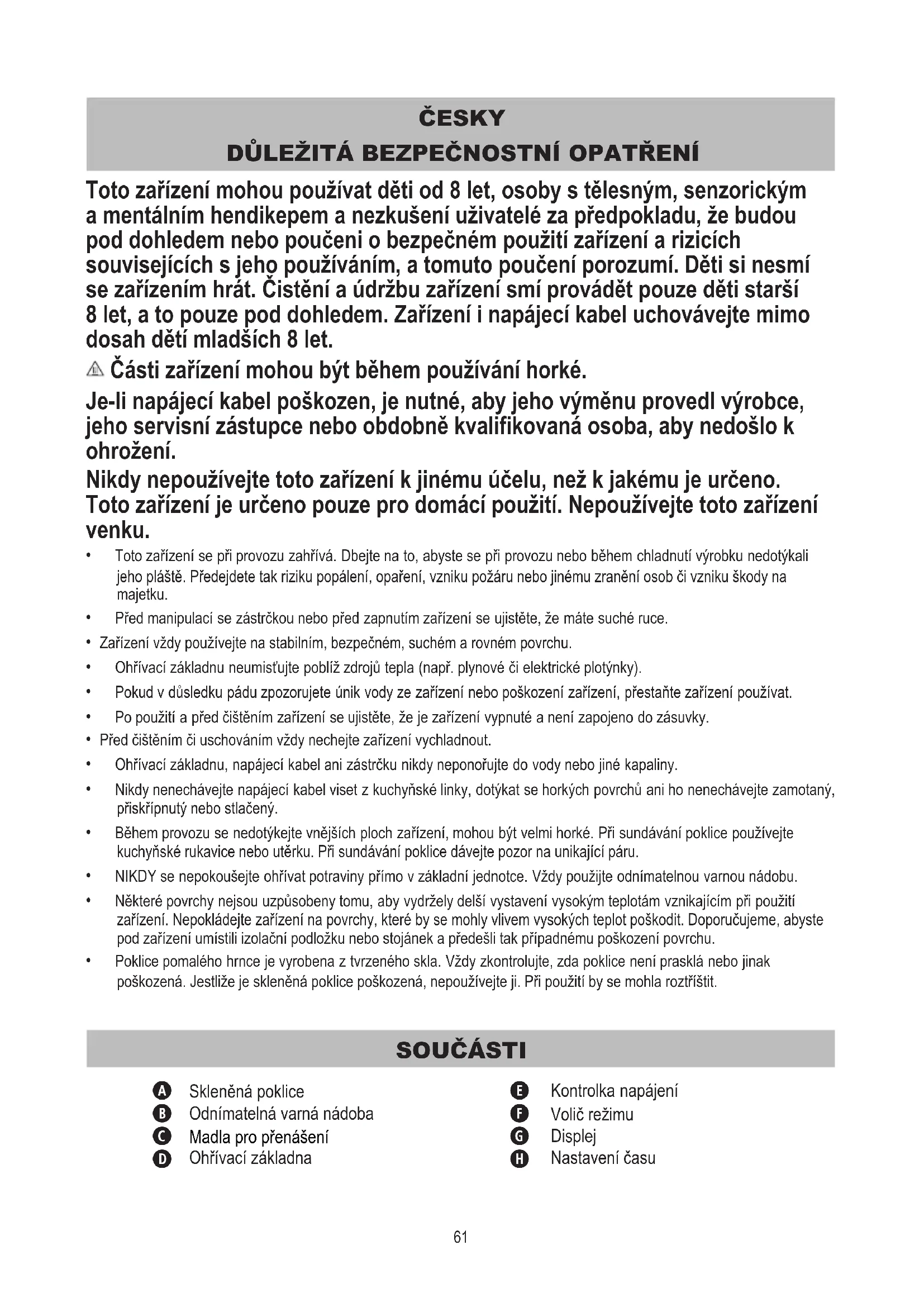 - Poklice pomalého hrnce je vyrobena z tvrzeného skla. Vždy zkontrolujte, zda poklice není prasklá nebo jinak poškozená. Jestliže je skleněná poklice poškozená, nepoužívejte ji. Při použití by se mohla roztříštit. SOUČÁSTI