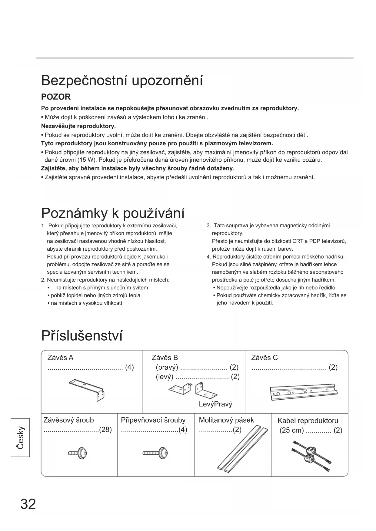 - Zajistěte správné provedení instalace, abyste předešli uvolnění reproduktorů a tak i možnému zranění. Bezpečnostní upozornění Příslušenství