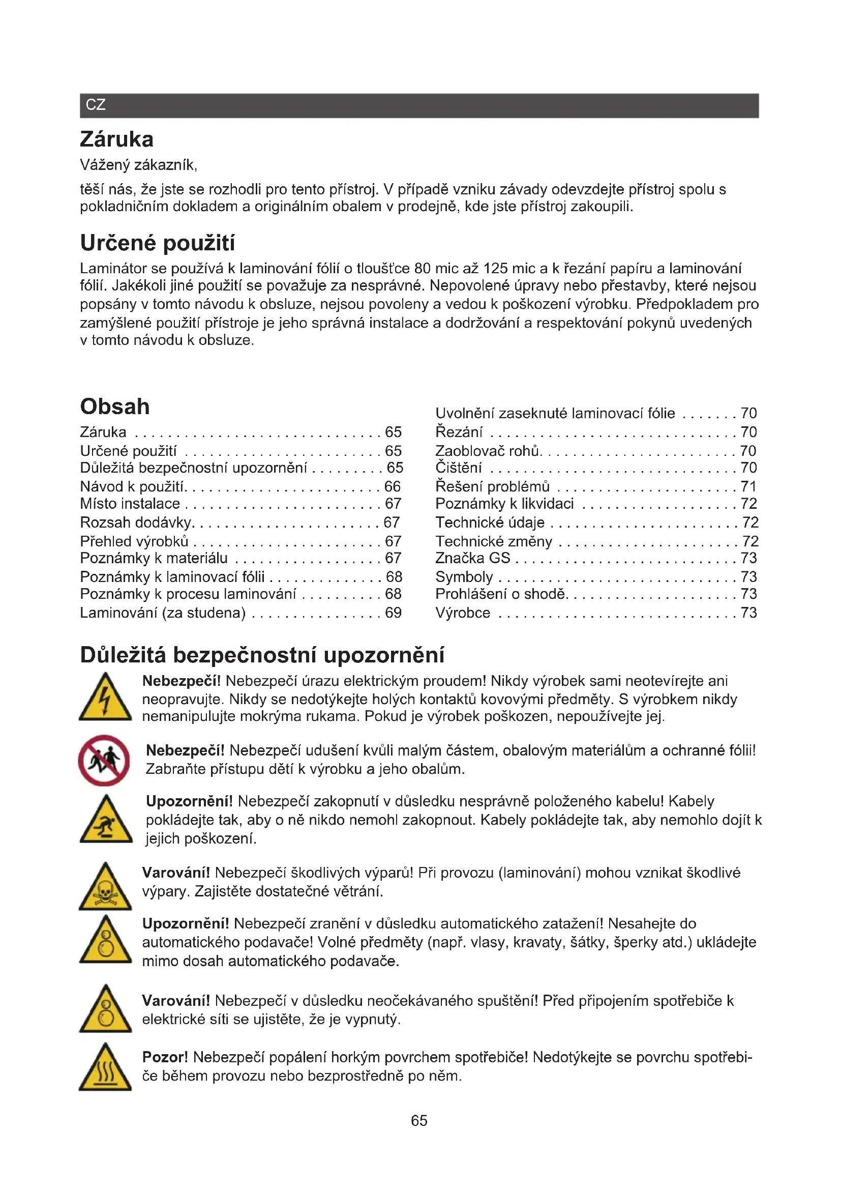 - Záruka Vážený zákazník, těší nás, že jste se rozhodli pro tento přístroj. V případě vzniku závady odevzdejte přístroj spolu s pokladničním dokladem a originálním obalem v prodejně, kde jste přístroj zakoupili. Určené použití Laminátor se používá k laminování fólií o tloušťce 80 mic až 125 mic a k řezání papíru a laminování fólií. Jakékoli jiné použití se považuje za nesprávné. Nepovolené úpravy nebo přestavby, které nejsou popsány v tomto návodu k obsluze, nejsou povoleny a vedou k poškození výrobku. Předpokladem pro zamýšlené použití přístroje je jeho správná instalace a dodržování a respektování pokynů uvedených v tomto návodu k obsluze. Obsah Záruka p. 65