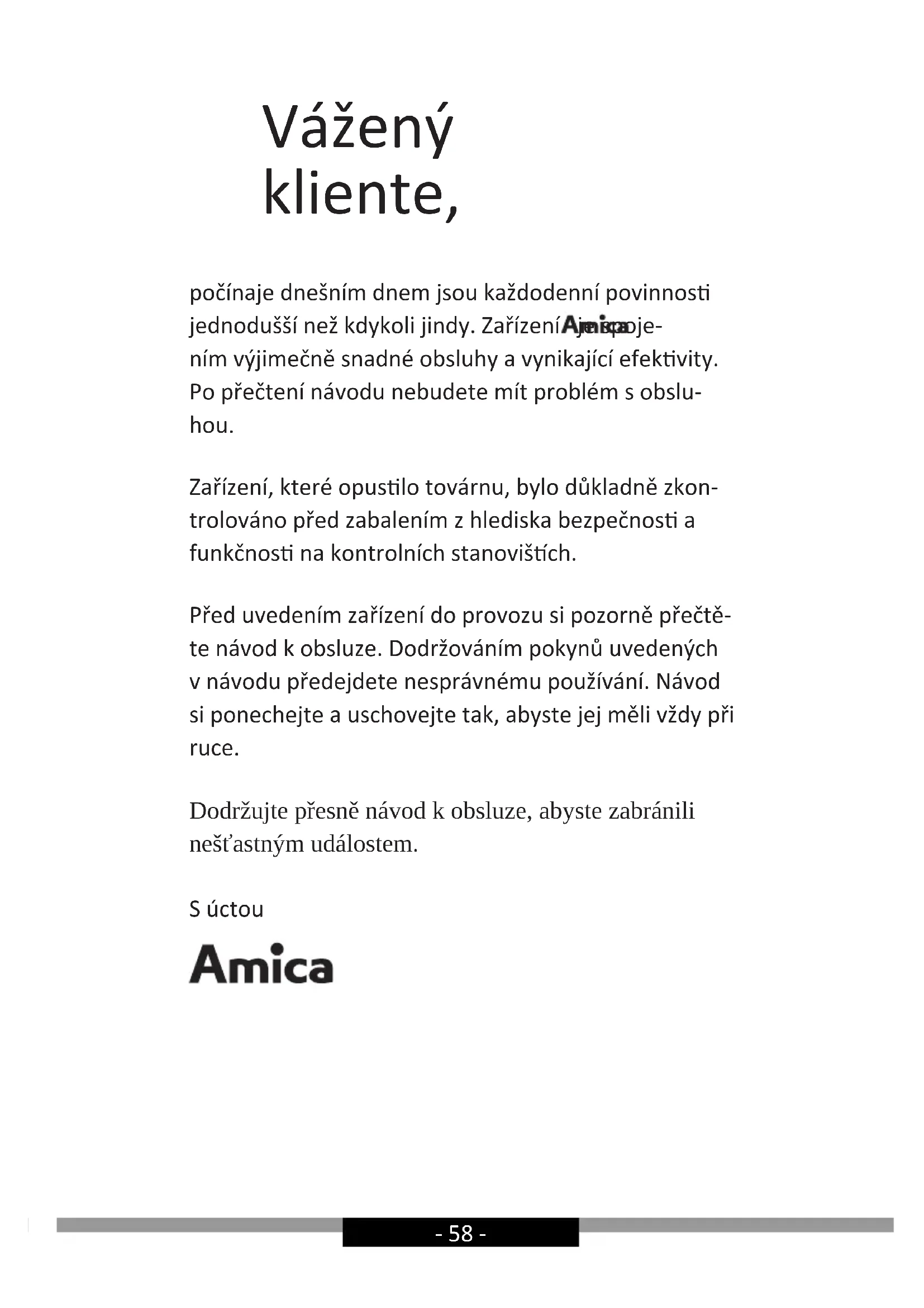 - Niederspannungsrichtlinie 2014/35/EG• Elektromagnetische Verträglichkeit 2014/30/EG• ErP – Richtlinie 2009/125/EG• Richtlinie RoHS 2011/65/EG Das Gerät ist mit dem Zeichen gekennzeichnet und verfügt über eine Konformitätserklärung zur Einsichtnahme durch die zuständigen Marktüberwa- chungsbehörden.- 58 - Vážený kliente, počínaje dnešním dnem jsou každodenní povinnos jednodušší než kdykoli jindy. Zařízení je spoje- ním výjimečně snadné obsluhy a vynikající efekvity. Po přečtení návodu nebudete mít problém s obslu- hou. Zařízení, které opuslo továrnu, bylo důkladně zkon- trolováno před zabalením z hlediska bezpečnos a funkčnos na kontrolních stanovišch. Před uvedením zařízení do provozu si pozorně přečtě- te návod k obsluze. Dodržováním pokynů uvedených v návodu předejdete nesprávnému používání. Návod si ponechejte a uschovejte tak, abyste jej měli vždy při ruce. Dodržujte přesně návod k obsluze, abyste zabránili nešťastným událostem. S úctou- 59 -