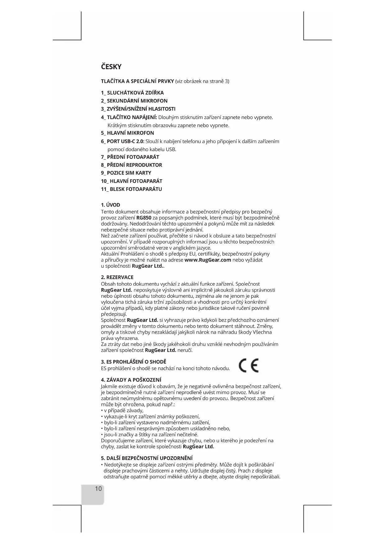 Tento dokument obsahuje informace a bezpečnostní předpisy pro bezpečný provoz zařízení RG850 za popsaných podmínek, které musí být bezpodmínečně dodržovány. Nedodržování těchto upozornění a pokynů může mít za následek nebezpečné situace nebo protiprávní jednání. Než začnete zařízení používat, přečtěte si návod k obsluze a tato bezpečnostní upozornění. V případě rozporuplných informací jsou u těchto bezpečnostních upozornění směrodatné verze v anglickém jazyce. Aktuální Prohlášení o shodě s předpisy EU, certifikáty, bezpečnostní pokyny a příručky je možné nalézt na adrese www.RugGear.com nebo vyžádat u společnosti RugGear Ltd..