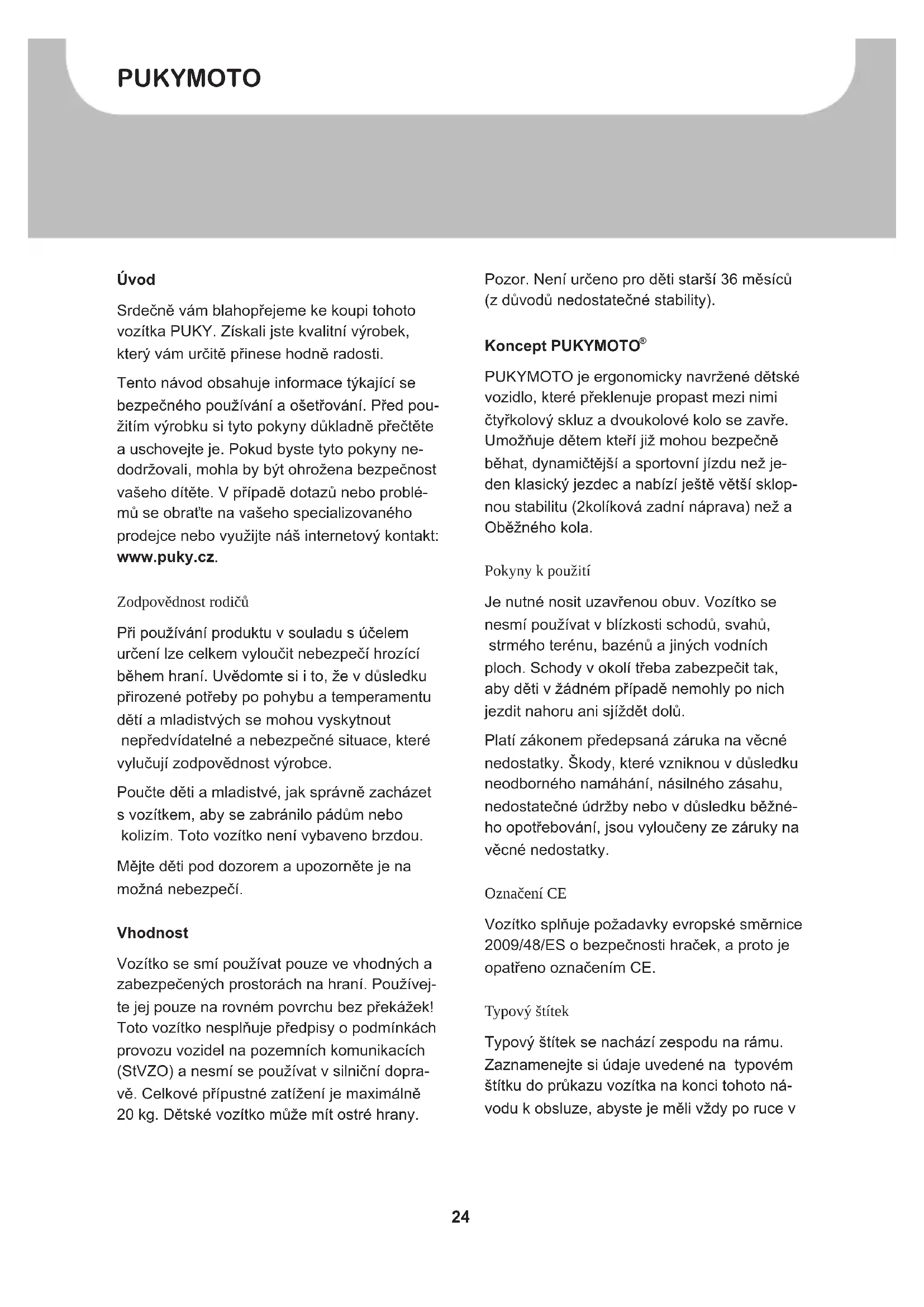 Srdečné vám blahopřejeme ke koupi tohoto vozítka PUKY. Získali jste kvalitní vyrobek, který vám určité prinese hodné radosti.