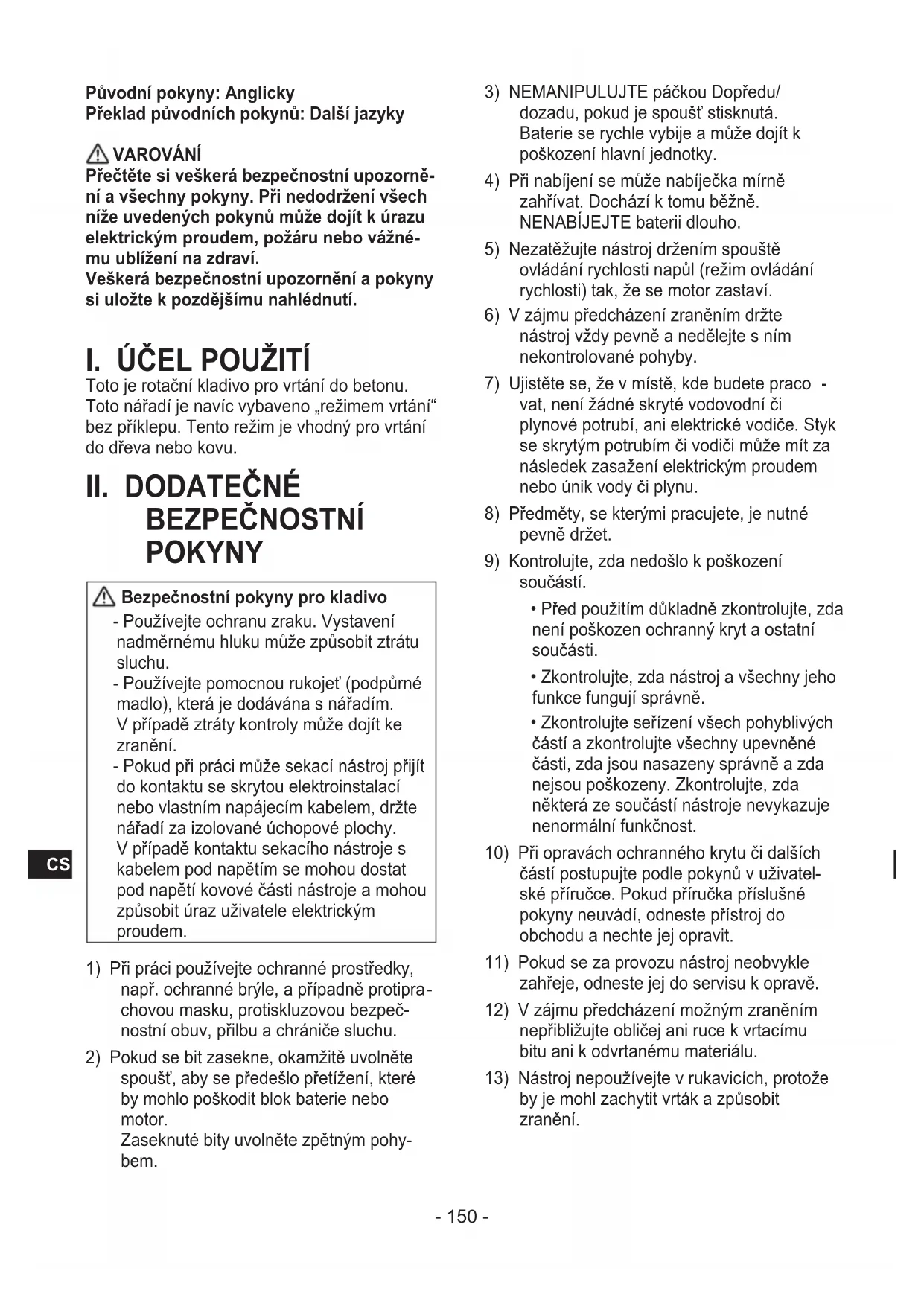BEZPEČNOSTNÍ POKYNY Bezpečnostní pokyny pro kladivo - Používejte ochranu zraku. Vystavení nadměrnému hluku může způsobit ztrátu sluchu. - Používejte pomocnou rukojeť (podpůrné madlo), která je dodávána s nářadím. V případě ztráty kontroly může dojít ke zranění. - Pokud při práci může sekací nástroj přijít do kontaktu se skrytou elektroinstalací nebo vlastním napájecím kabelem, držte nářadí za izolované úchopové plochy. V případě kontaktu sekacího nástroje s kabelem pod napětím se mohou dostat pod napětí kovové části nástroje a mohou způsobit úraz uživatele elektrickým proudem.