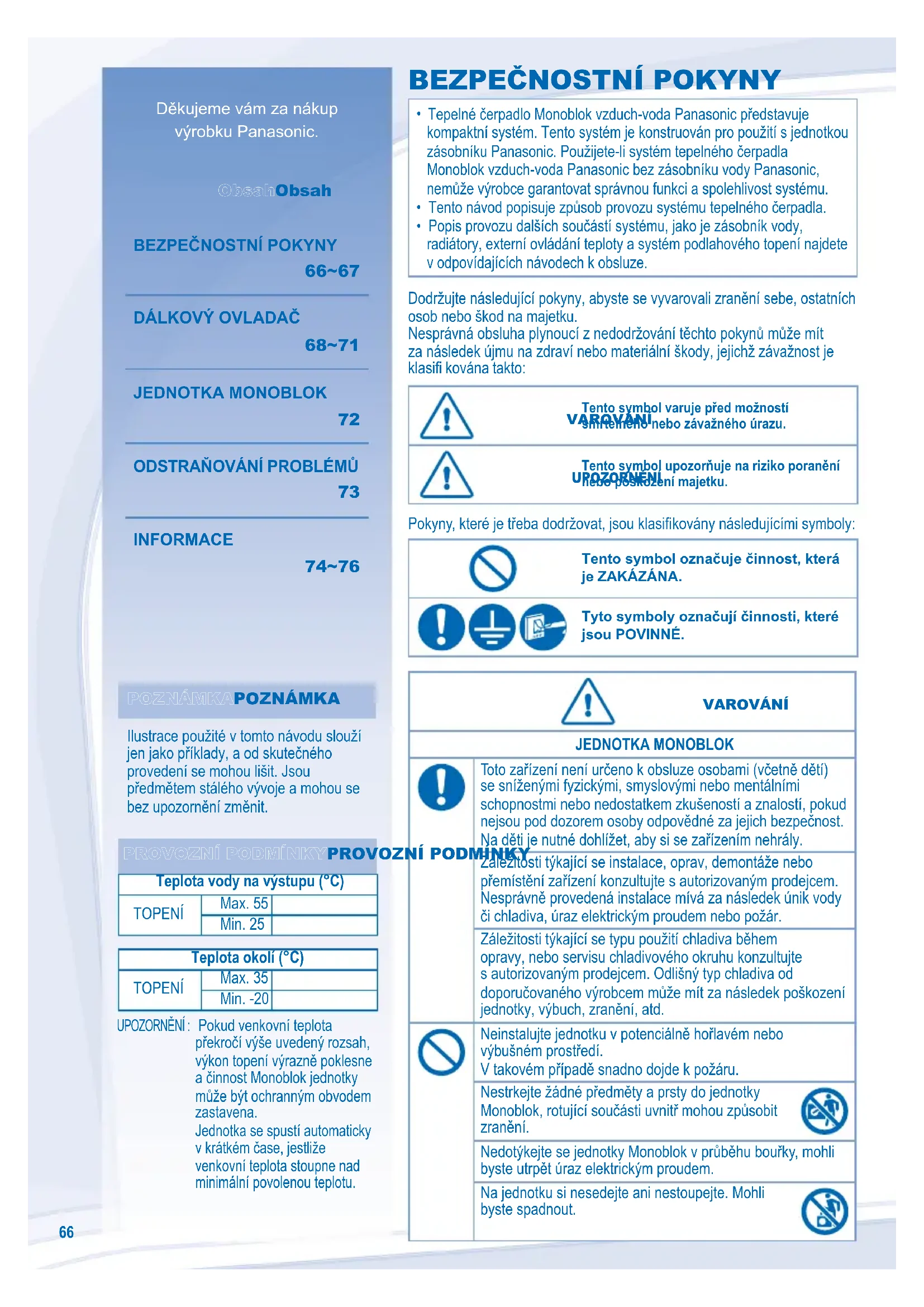Teplota vody na výstupu (°C) TOPENÍ Max. 55 Min. 25 Teplota okolí (°C) TOPENÍ Max. 35 Min. -20 UPOZORNĚNÍ : Pokud venkovní teplota překročí výše uvedený rozsah, výkon topení výrazně poklesne a činnost Monoblok jednotky může být ochranným obvodem zastavena. Jednotka se spustí automaticky v krátkém čase, jestliže venkovní teplota stoupne nad minimální povolenou teplotu. Dodržujte následující pokyny, abyste se vyvarovali zranění sebe, ostatních osob nebo škod na majetku. Nesprávná obsluha plynoucí z nedodržování těchto pokynů může mít za následek újmu na zdraví nebo materiální škody, jejichž závažnost je klasifi kována takto: