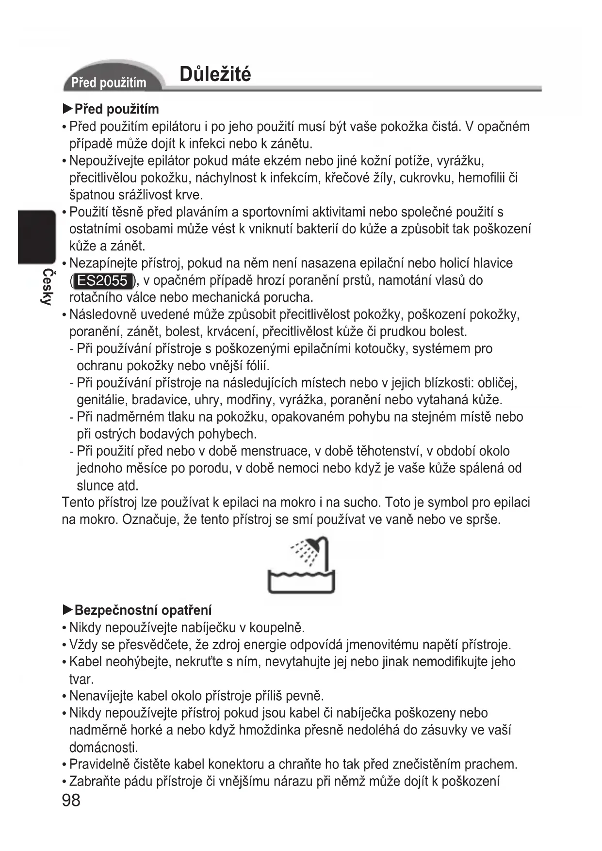 ES2055 ), v opačném případě hrozí poranění prstů, namotání vlasů do rotačního válce nebo mechanická porucha. Následovně uvedené může způsobit přecitlivělost pokožky, poškození pokožky, poranění, zánět, bolest, krvácení, přecitlivělost kůže či prudkou bolest. Při používání přístroje s poškozenými epilačními kotoučky, systémem pro ochranu pokožky nebo vnější fólií. Při používání přístroje na následujících místech nebo v jejich blízkosti: obličej, genitálie, bradavice, uhry, modřiny, vyrážka, poranění nebo vytahaná kůže. Při nadměrném tlaku na pokožku, opakovaném pohybu na stejném místě nebo při ostrých bodavých pohybech. Při použití před nebo v době menstruace, v době těhotenství, v období okolo jednoho měsíce po porodu, v době nemoci nebo když je vaše kůže spálená od slunce atd. Tento přístroj lze používat k epilaci na mokro i na sucho. Toto je symbol pro epilaci na mokro. Označuje, že tento přístroj se smí používat ve vaně nebo ve sprše. 1Bezpečnostníopatření Nikdy nepoužívejte nabíječku v koupelně. Vždy se přesvědčete, že zdroj energie odpovídá jmenovitému napětí přístroje. Kabel neohýbejte, nekruťte s ním, nevytahujte jej nebo jinak nemodikujte jeho tvar. Nenavíjejte kabel okolo přístroje příliš pevně. Nikdy nepoužívejte přístroj pokud jsou kabel či nabíječka poškozeny nebo nadměrně horké a nebo když hmoždinka přesně nedoléhá do zásuvky ve vaší domácnosti. Pravidelně čistěte kabel konektoru a chraňte ho tak před znečistěním prachem. Zabraňte pádu přístroje či vnějšímu nárazu při němž může dojít k poškození