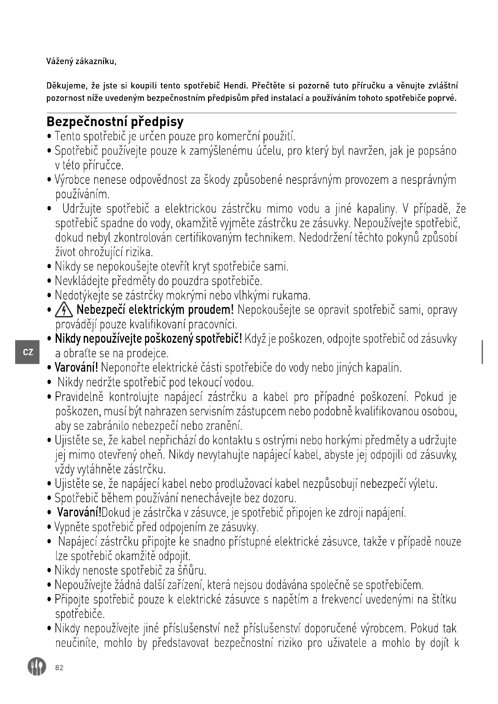 Vážený zákazníku, Děkujeme, že jste si koupili tento spotřebič Hendi. Přečtěte si pozorně tuto příručku a věnujte zvláštní pozornost níže uvedeným bezpečnostním předpisům před instalací a používáním tohoto spotřebiče poprvé. Bezpečnostní předpisy
